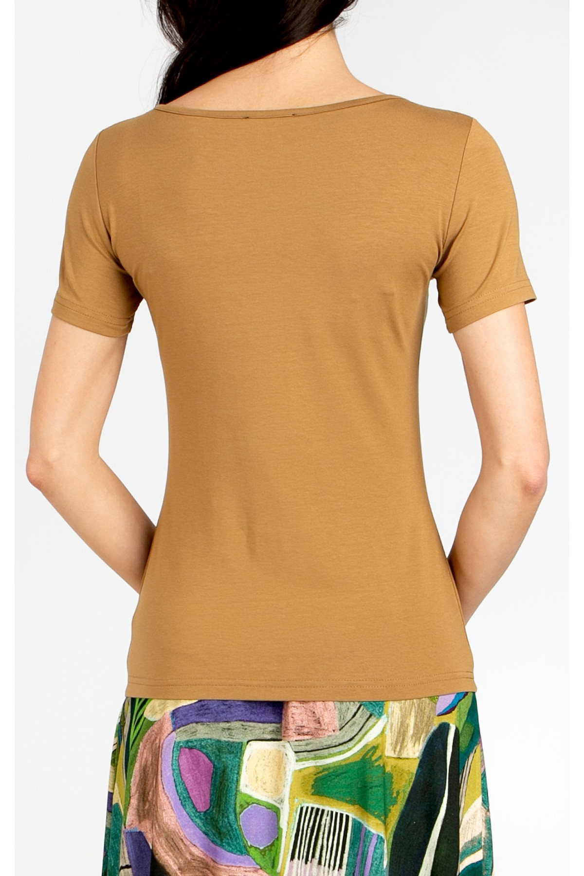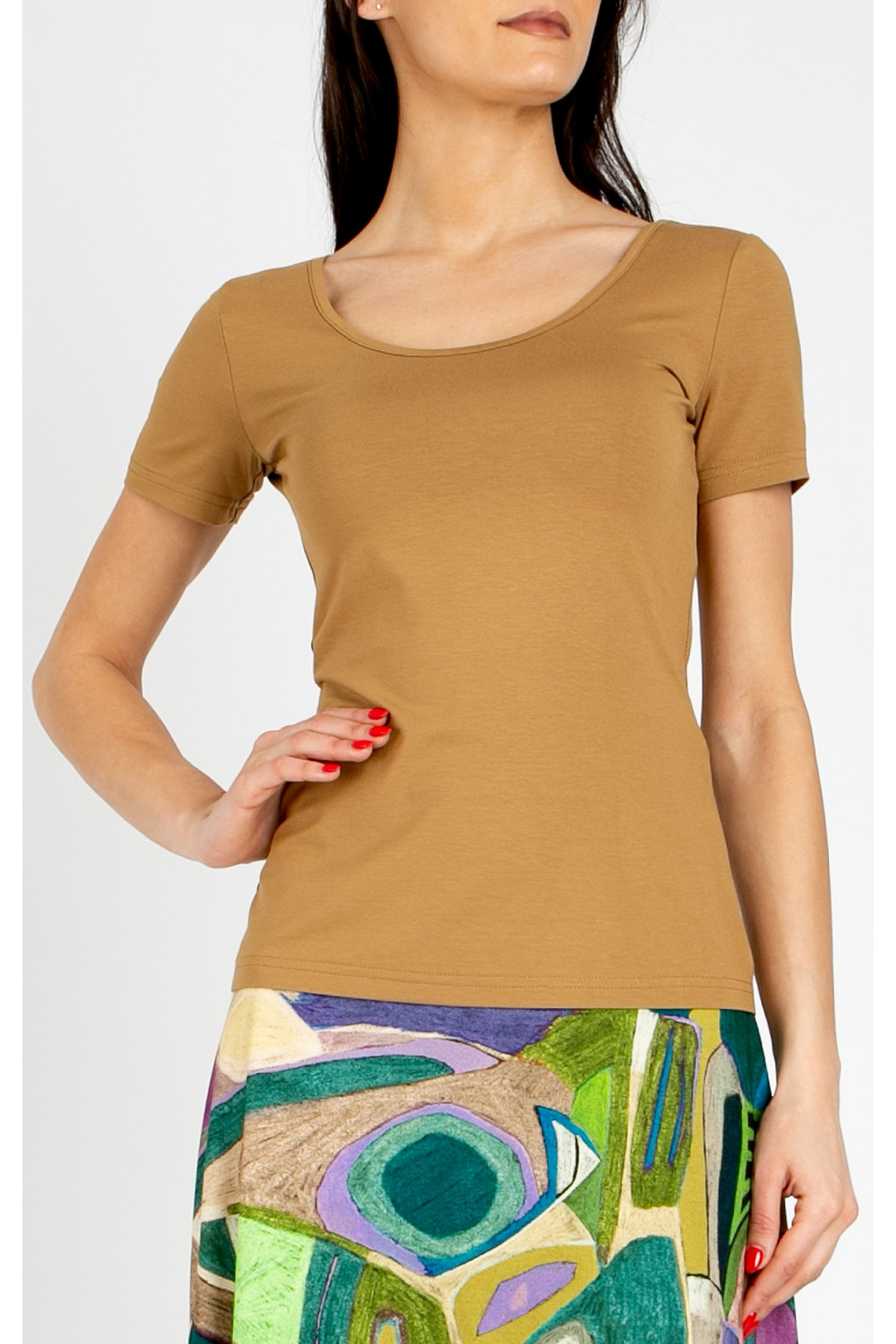 Bluză cambrată în culoarea Medal Bronze. Modelul are decolteu rotund finisat cu tiv și mânecă scurtă. Realizată din tricot moale, se așază ușor pe corp și oferă confort pe tot parcursul zilei. Se combină cu ușurință cu fuste, pantaloni sau denim, în funcție de stilul dorit.