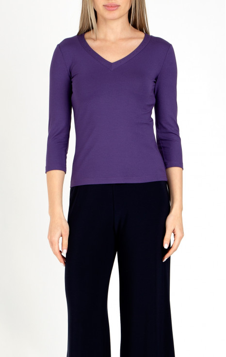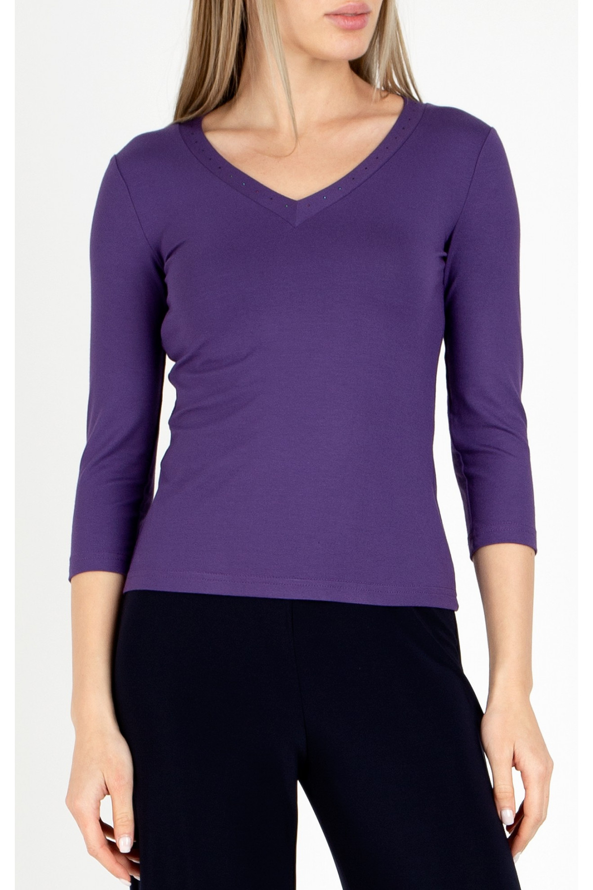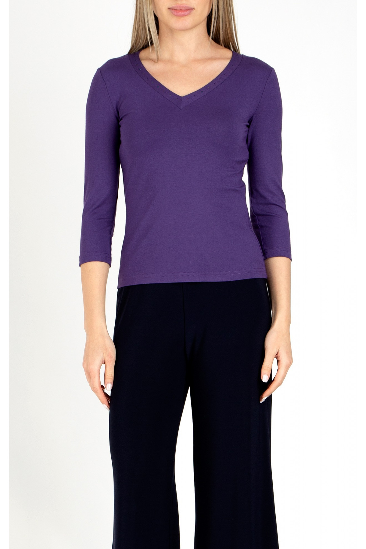 Bluză clasică cu pietre Swarovski pe linia decolteului, de culoare Purple Sapphire. Modelul bluzei este confecționat dintr-un material tricotat moale și elastic, decolteu în formă de V, bordură largă subliniat cu pietre strălucitoare Swarovski, mânecă 3/4. O alegere excelentă pentru cei cărora le place confortul în viața de zi cu zi și la birou. Combinați ușor cu fustă sau pantaloni. Această bluză este disponibilă în mărimile de la 36 până la 46.