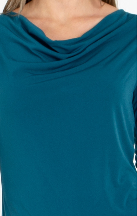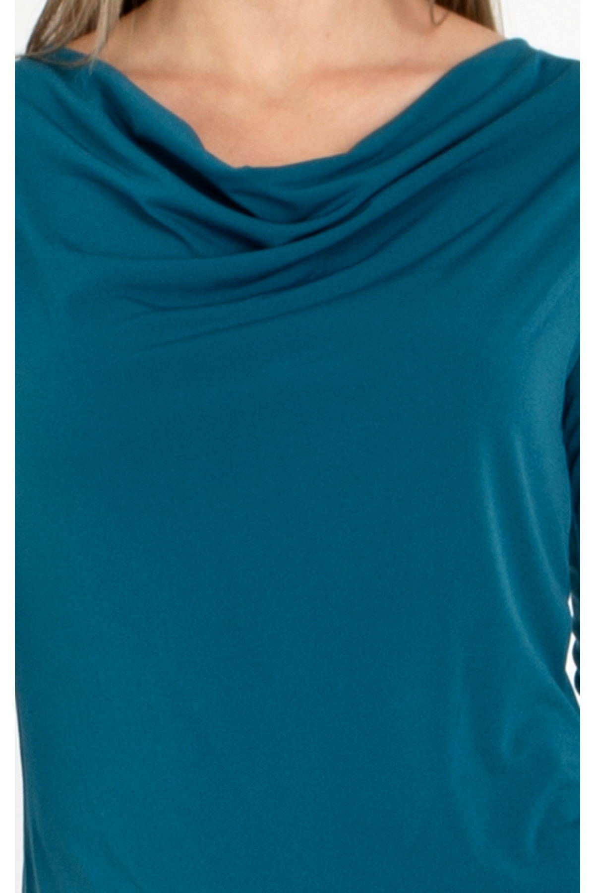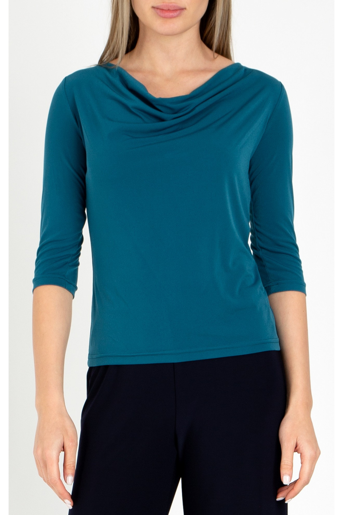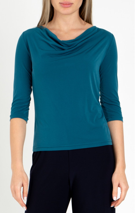 Bluză cu decolteu drapat de culoare Blue Coral din tricot ușor tip jerseu. Modelul bluzei are decolteu spectaculos drapat și mânecă 3/4. O bluză ușoară și comodă, ceea ce o face potrivită pentru birou și viața de zi cu zi. Bluza este disponibilă în mărimile de la 36 până la 48.