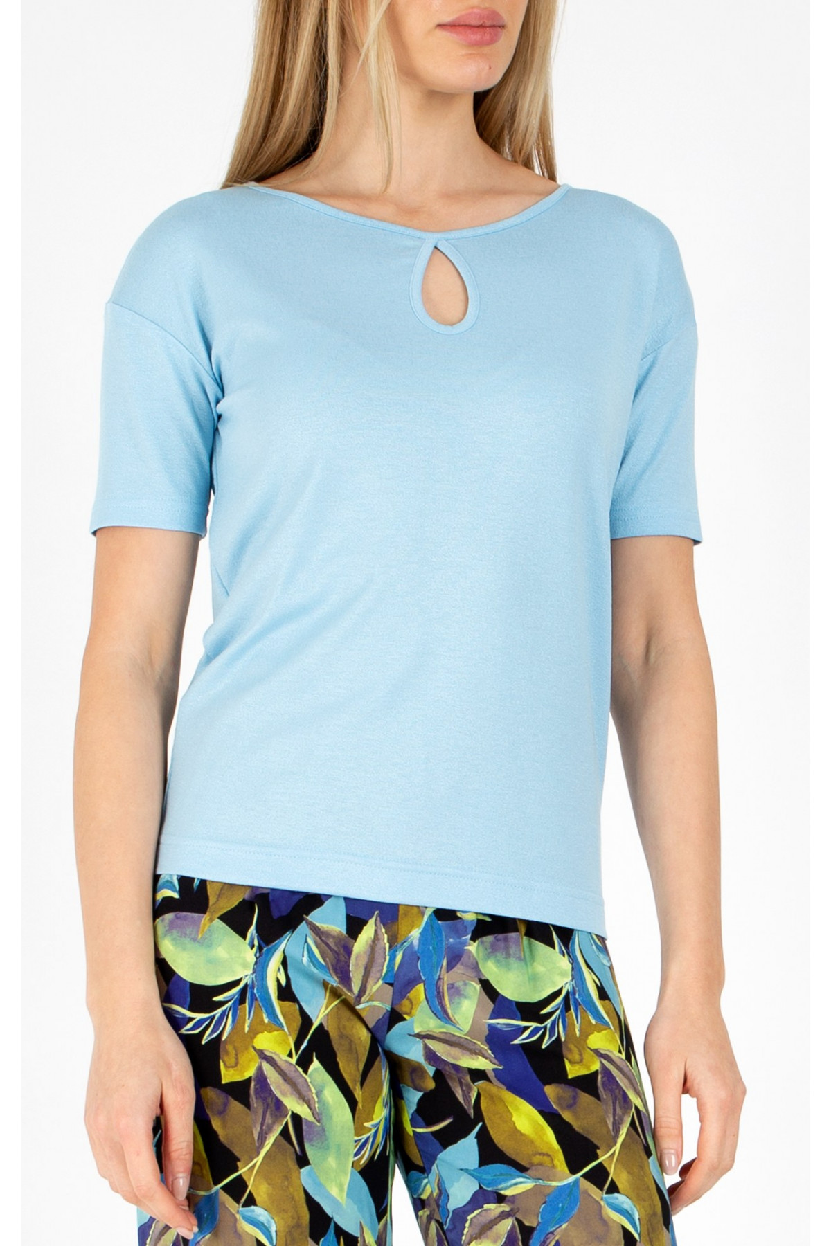 Bluză cu design modern cu siluetă lejeră de culoare Dream Blue. Modelul bluzei are mânecă scurtă, decolteu tip barcă și o decupare în formă de picătură. Aceasta este confecționată dintr-un jerseu moale și elastic într-o culoare delicată albastru deschis, Țesătura elastică și ușoară o face potrivită pentru viața de zi cu zi și pentru birou și poate fi ușor combinată cu o fustă, pantaloni sau blugi. Bluza este disponibilă în mărimile de la S până la 2XL.