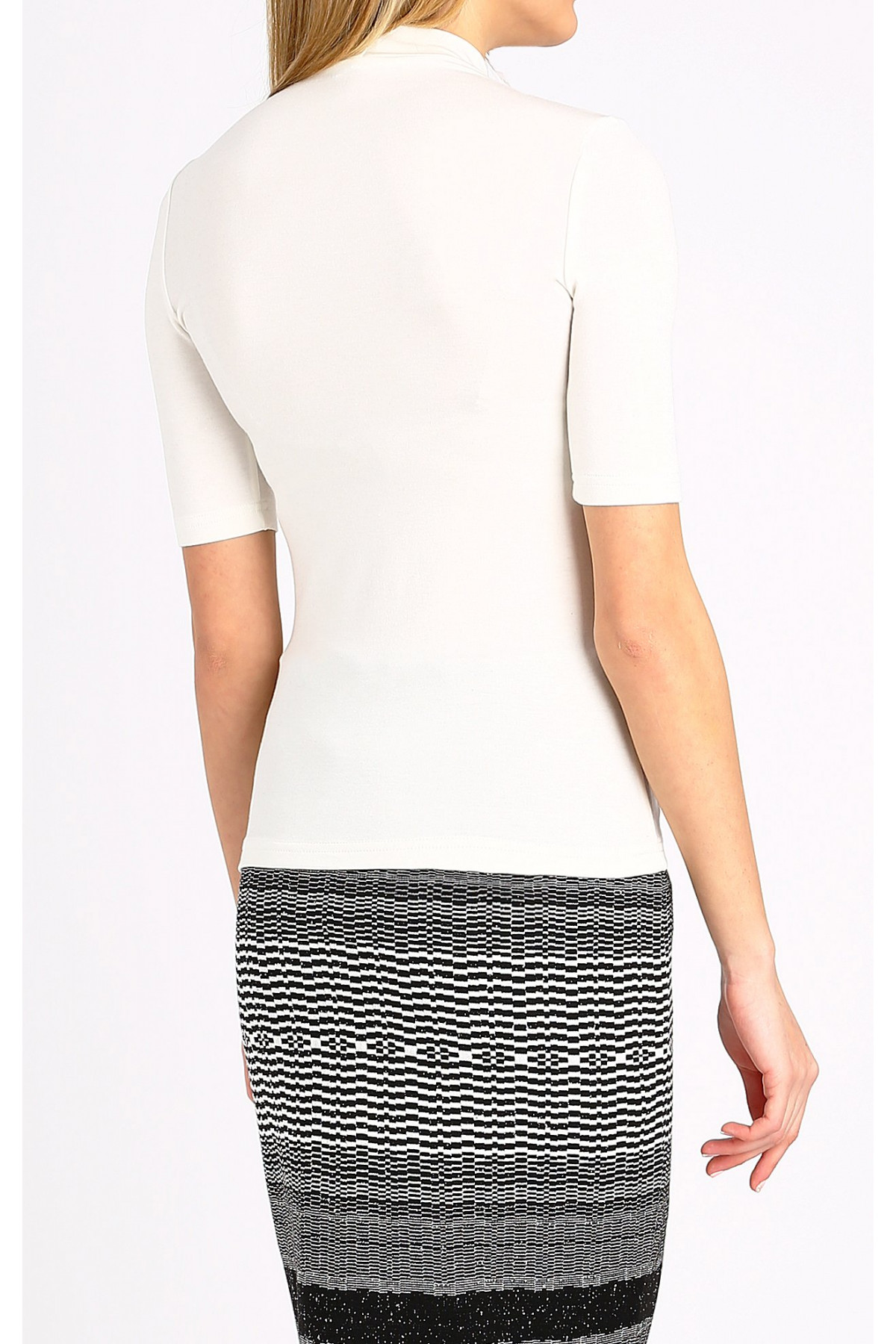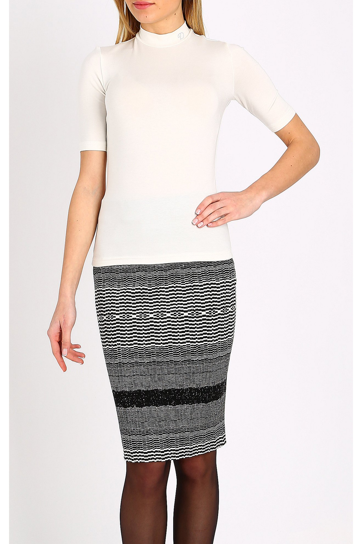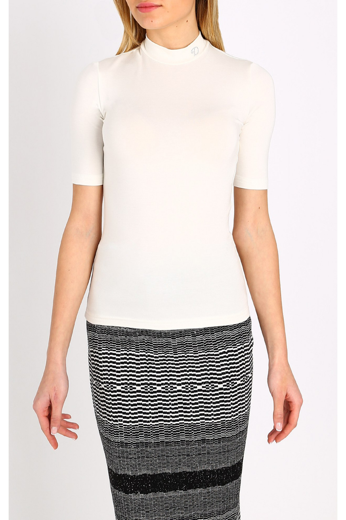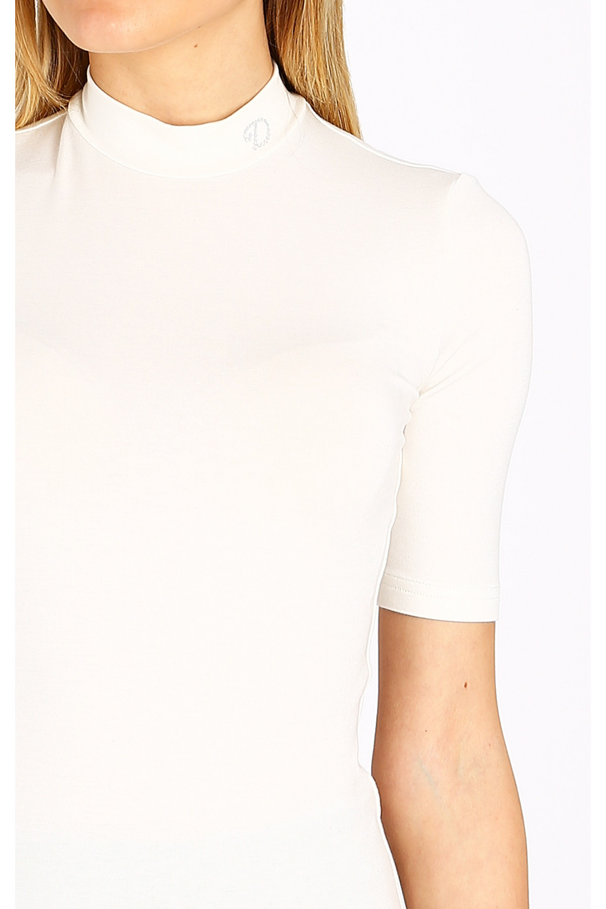 Bluză cu accent pe guler – logo din cristale Swarovski. Confecționată dintr-un material de tricot elastic și moale, de culoare Coconut Milk. Modelul bluzei are guler jos tip maleta și mânecă scurtă. Se combină ușor cu diferiți pantaloni și diferite fuste din colecția noastră, permițând obținerea unei varietăți de viziuni.