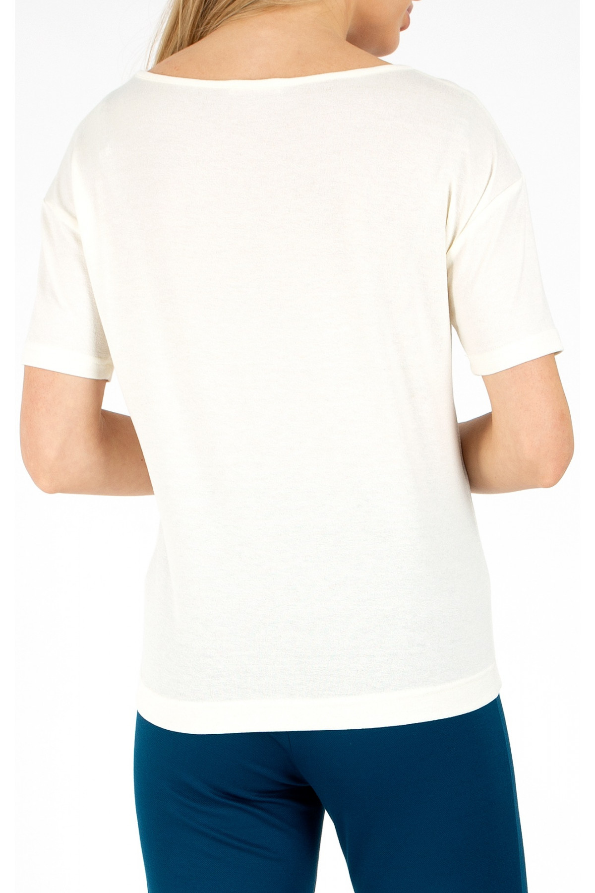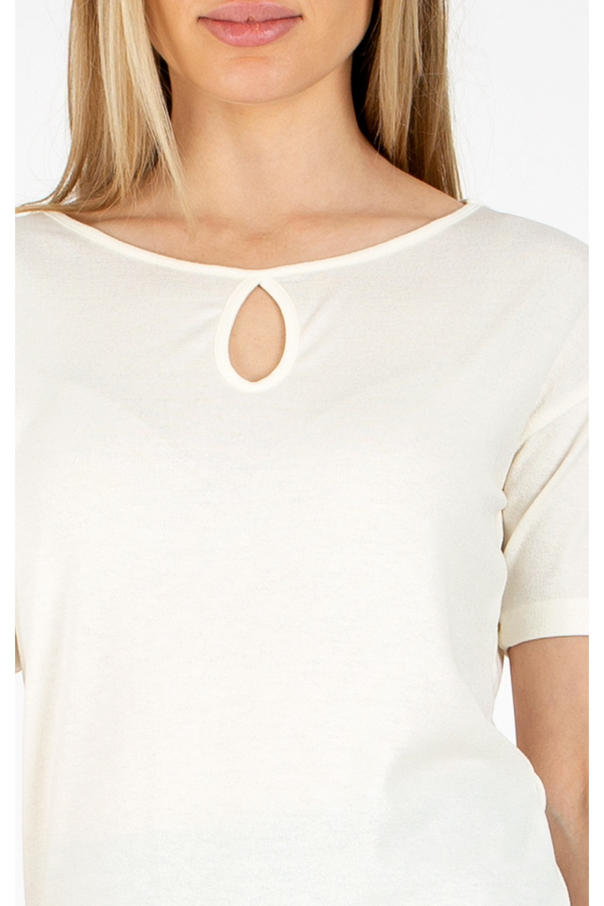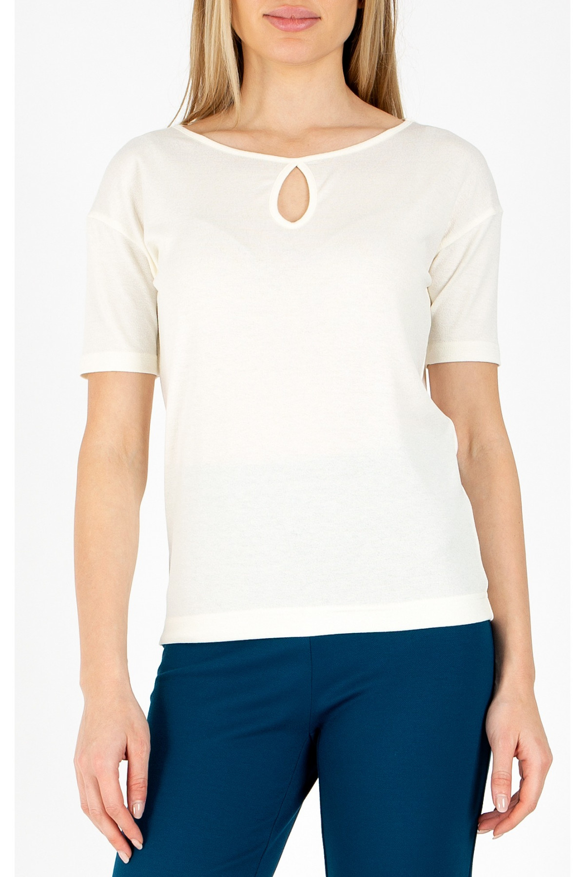 Bluză cu siluetă lejeră cu decupare în formă de picătură la decolteu de culoare Cocconut milk. Această bluza este confecționată din jerseu moale și elastic de culoare alb lăptos. Țesătura elastică și ușoară, face această bluză să fie combinați cu fustă, pantaloni sau blugi.
