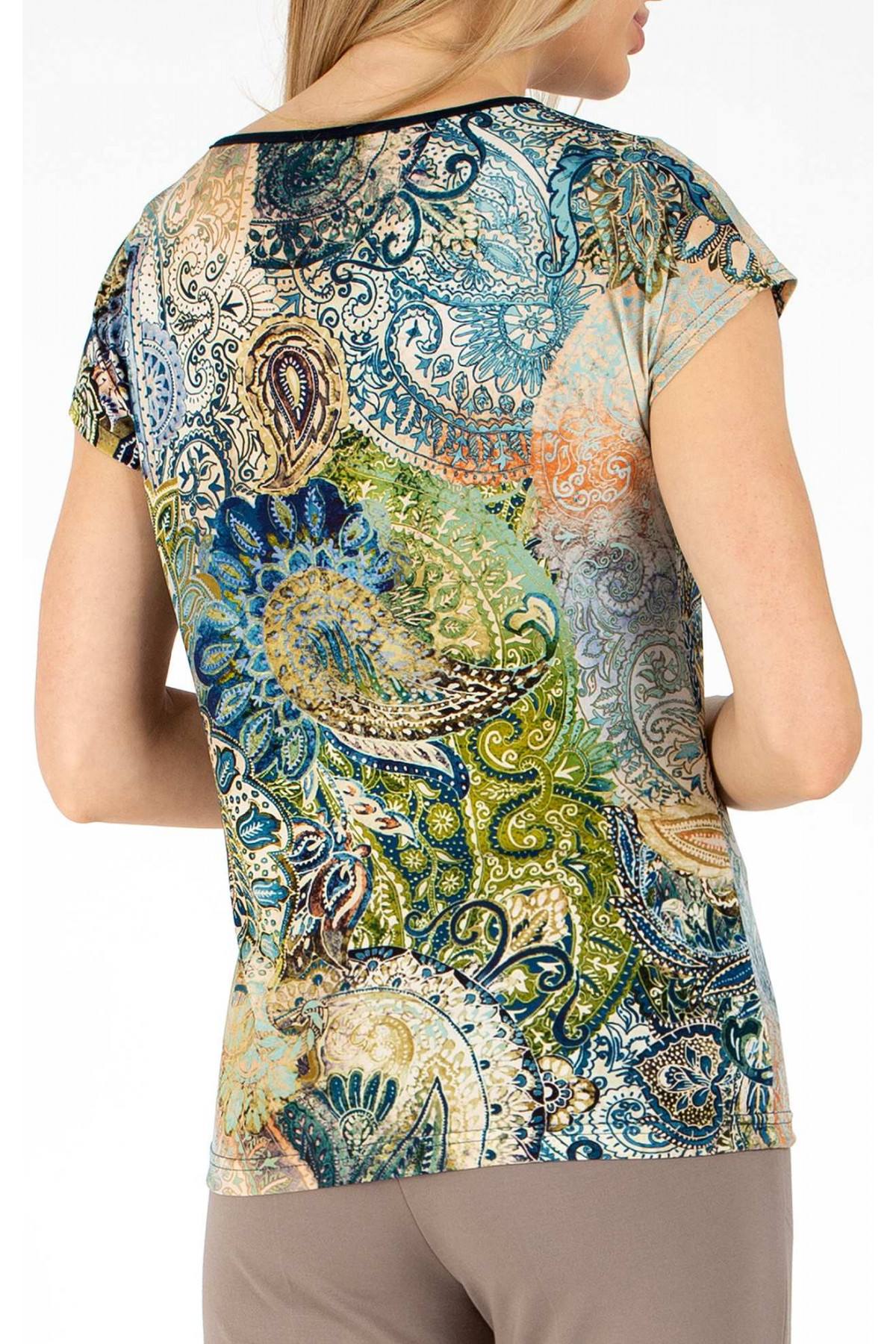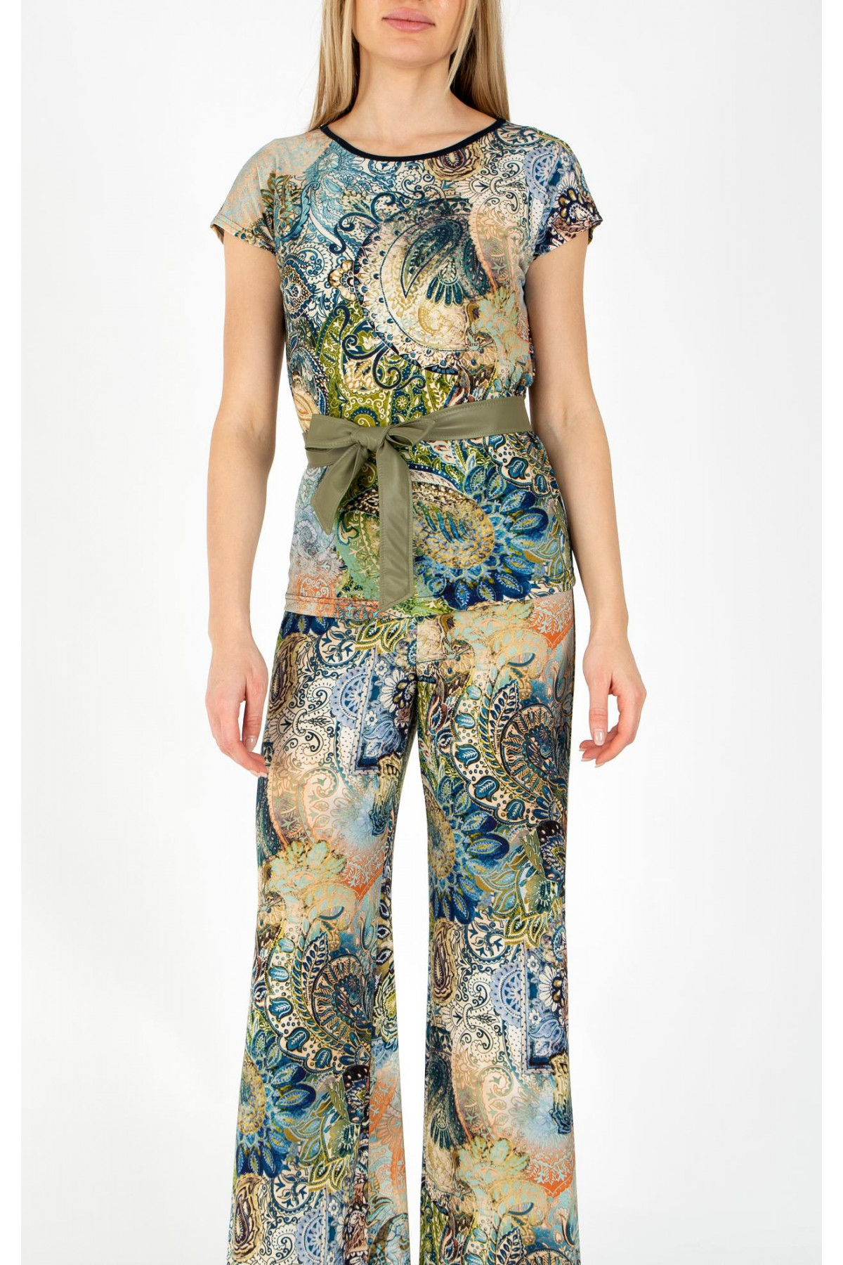 Bluză cu siluetă lejeră cu imprimeu grafic și motive paisley în albastru, verde și portocaliu. Modelul bluzei are siluetă lejeră, decolteu tip barcă și mânecă scurtă căzută. Aceasta este confecționată din tricot tip jerseu cu un imprimeu bogat cu motive paisley. Puteți combina cu bluză din aceeași țesătură și cu același imprimeu. Bluza este disponibilă în mărimile de la S până la 4XL.