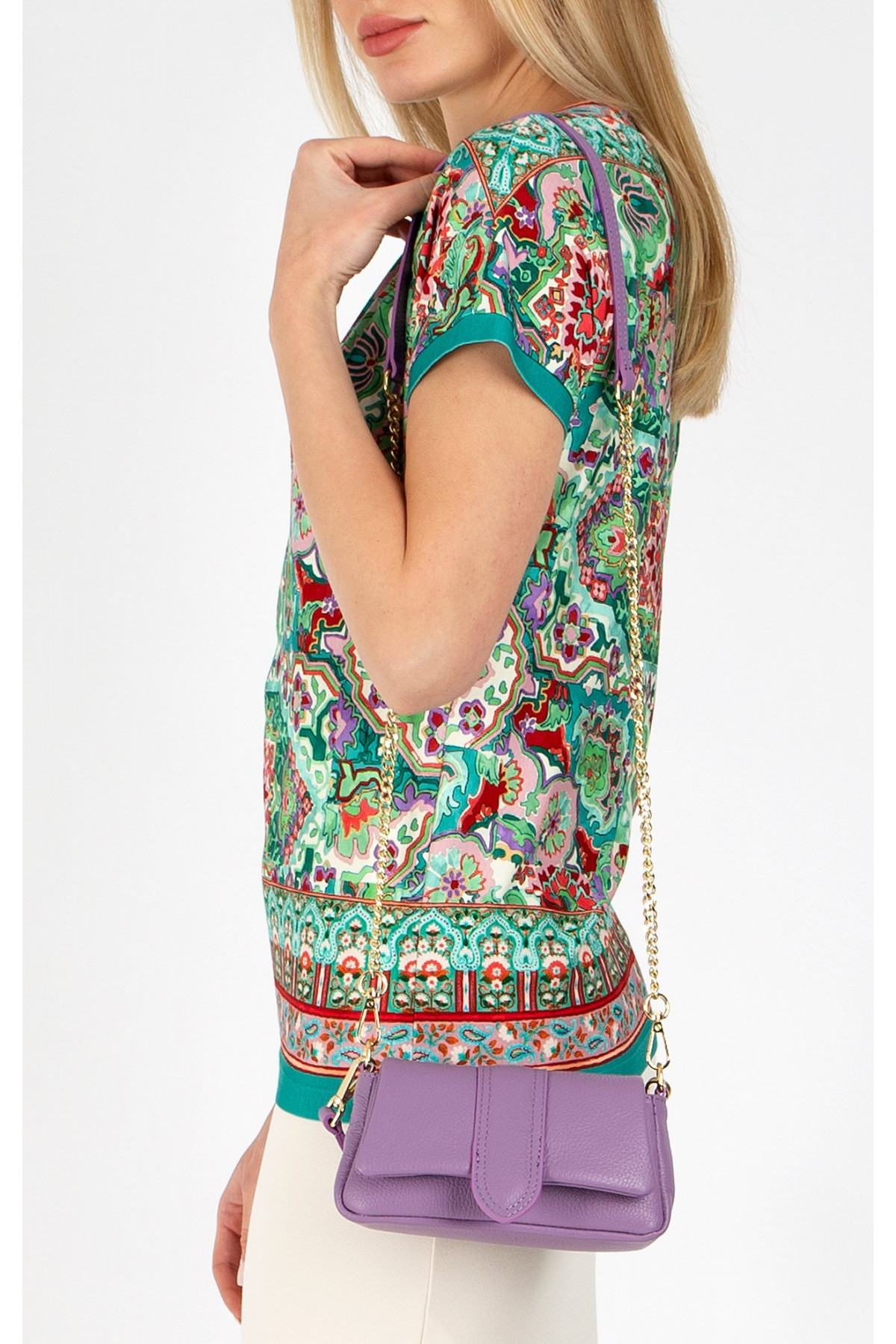 Bluză cu siluetă lejeră cu imprimeu stilizat colorat în gama verde. Modelul bluzei are decolteu rotund închis și mânecă scurtă căzut. O bluză de vară confortabilă, care aduce o dispoziție colorată în viața ta de zi cu zi. Amplasarea imprimeului poate varia în funcție de desen și mărime.