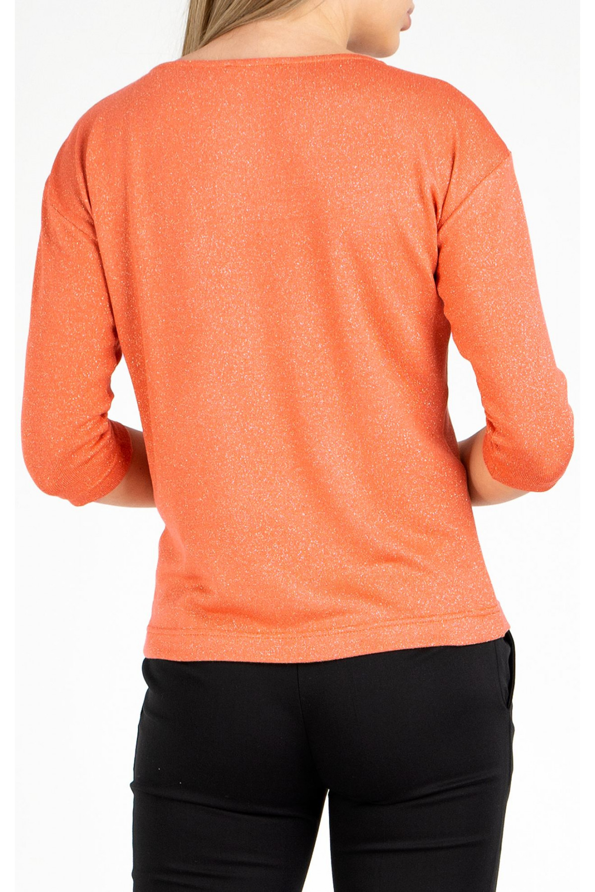 Bluză cu siluetă lejeră de culoare Flamingo cu luciu auriu. Modelul bluzei are mânecă 3/4, decolteu tip barcă, partea de sus este lejeră și ușor mulată în partea de jos. Aceasta se poate combina cu pantaloni eleganți sau fustă. Acest model este o alegere minunată pentru cine și evenimente festive. Bluza este confecționată în mărimile de la S până la XL.