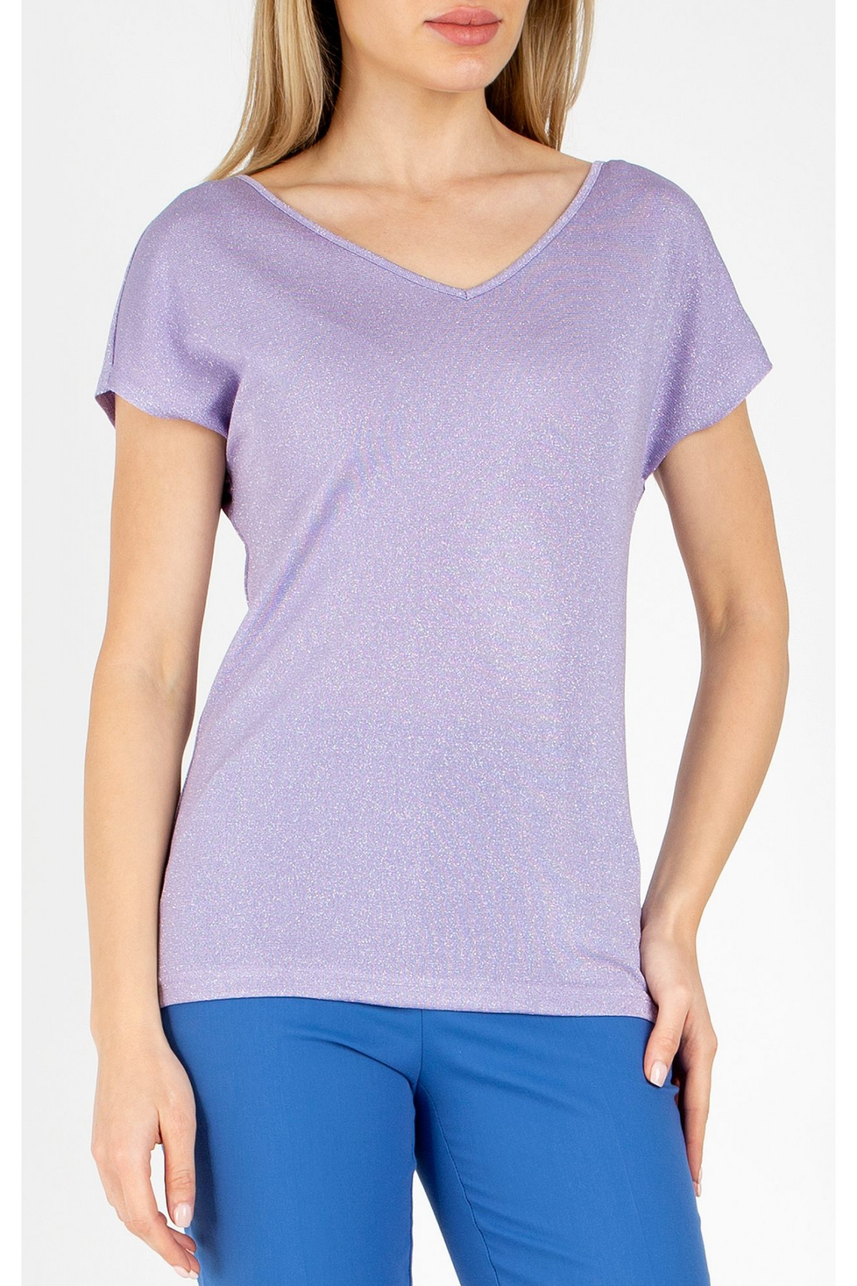Bluză cu siluetă lejeră de culoare Lavender cu reflecții delicate. Modelul bluzei are siluetă lejeră, mânecă scurtă căzută și decolteu în formă de V pe față și spate. Se combina ușor cu fuste sau pantaloni și completați aspectul dumneavoastră sport elegant cu strălucire. Talia se poate sublinia cu o curea din piele naturală din colecția Daphne. Bluza este disponibilă în mărimile de la S până la 3XL.