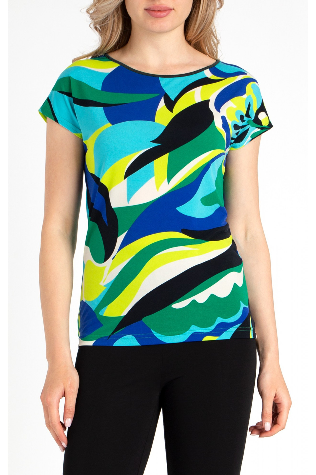 Bluză cu siluetă lejeră din tricot ușor tip jerse, imprimeu albastru și verde. Acest model este cu o croială lejeră în partea de sus, iar în partea de jos este ușor mulat, cu decolteu delicat tip barcă și mânecă căzută. Confecționată în mărimile de la S la 4XL. Amplasarea imprimeului poate varia în funcție de mărime.