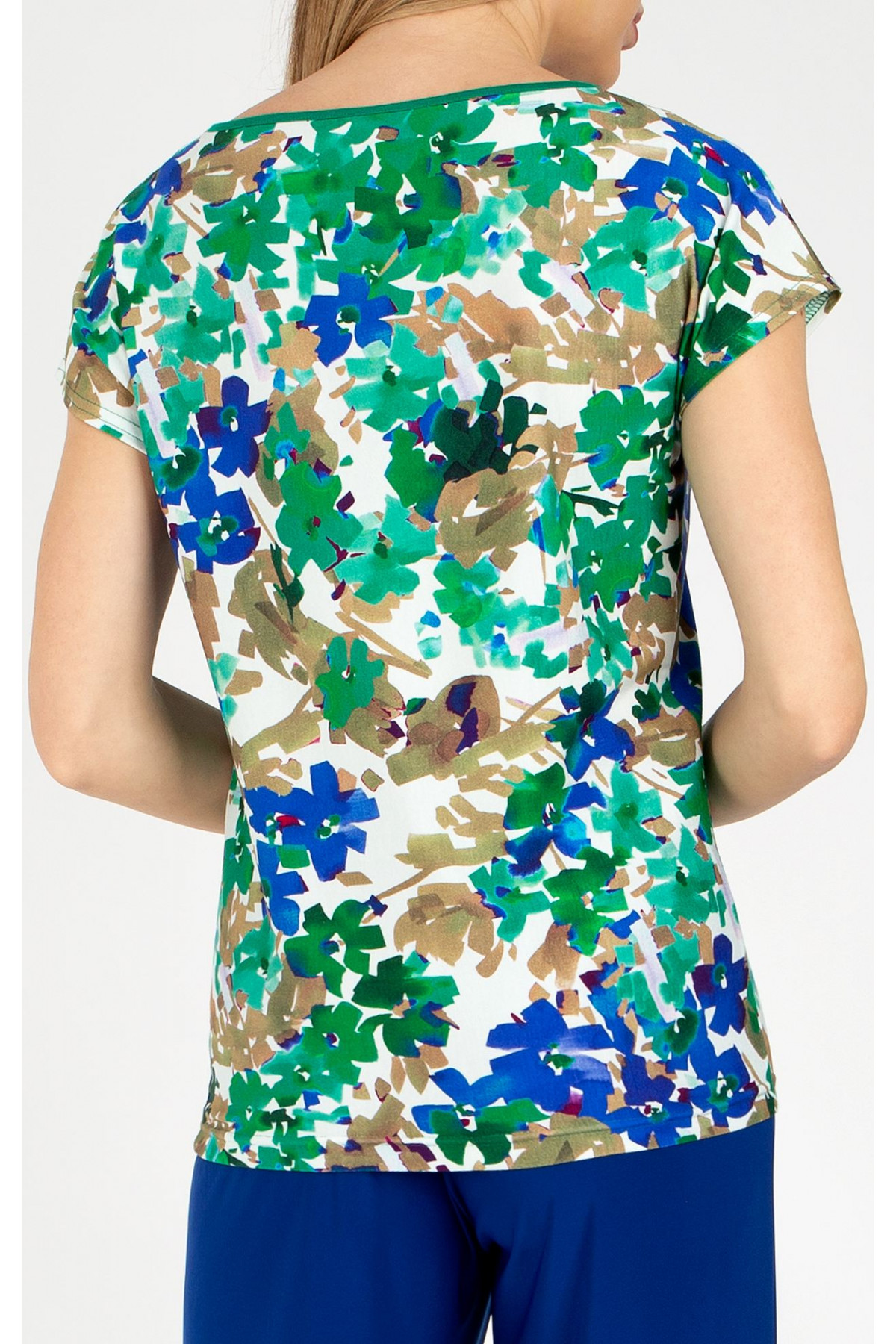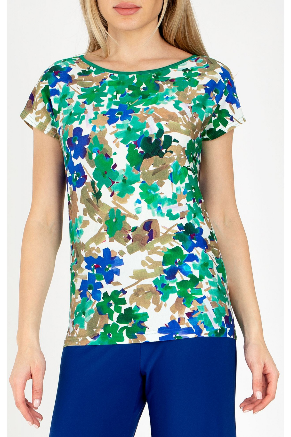 Bluză cu siluetă lejeră și imprimeu grafic în albastru și verde. Modelul bluzei are partea de sus lejeră, iar partea de jos este mulată, decolteu tip barcă și mânecă scurtă căzută. Materialul de tricot moale și elastic asigură confort și libertate la fiecare mișcare, o fac potrivită pentru ieșiri casual și întâlniri cu prietenii.