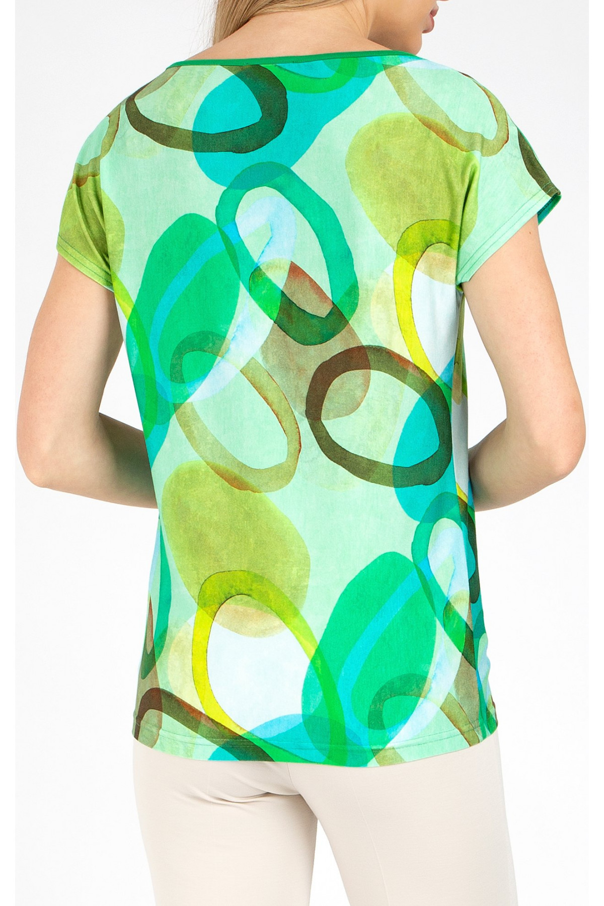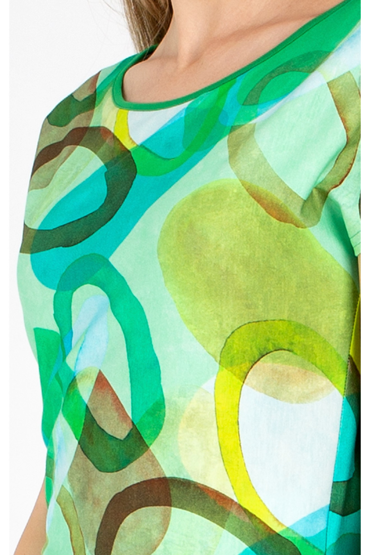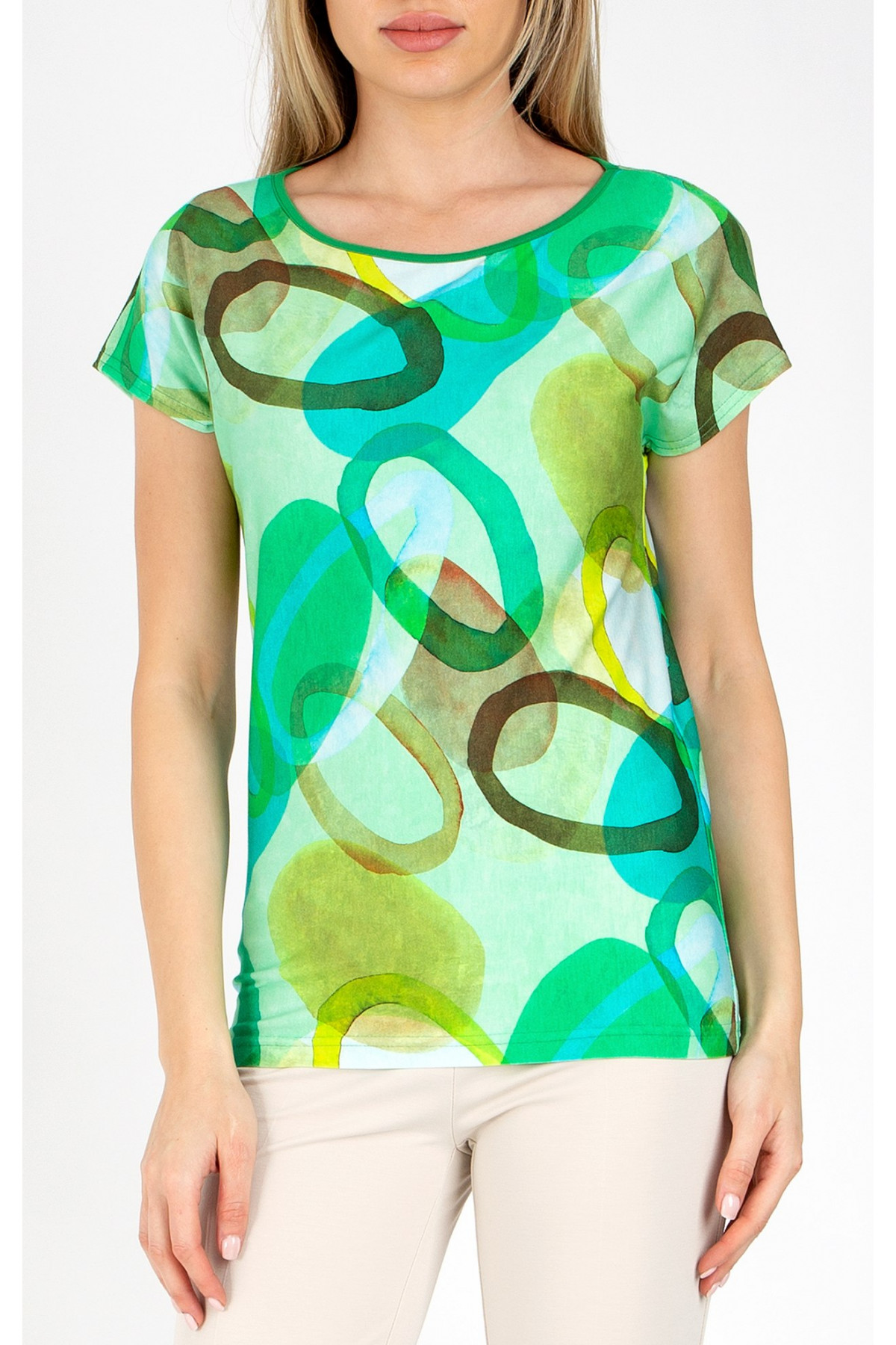 Bluză cu siluetă lejeră și imprimeu grafic, în culori vibrante de verde. Bluza este confecționată dintr-un material de tricot, partea de sus este lejeră, iar partea de jos este mulată, decolteu tip barcă și mânecă scurtă căzută. O croială comodă este o alegere excelentă pentru viața de zi cu zi și pentru orice tip de siluetă. Această bluză este disponibilă în mărimile de la S până la 4XL.