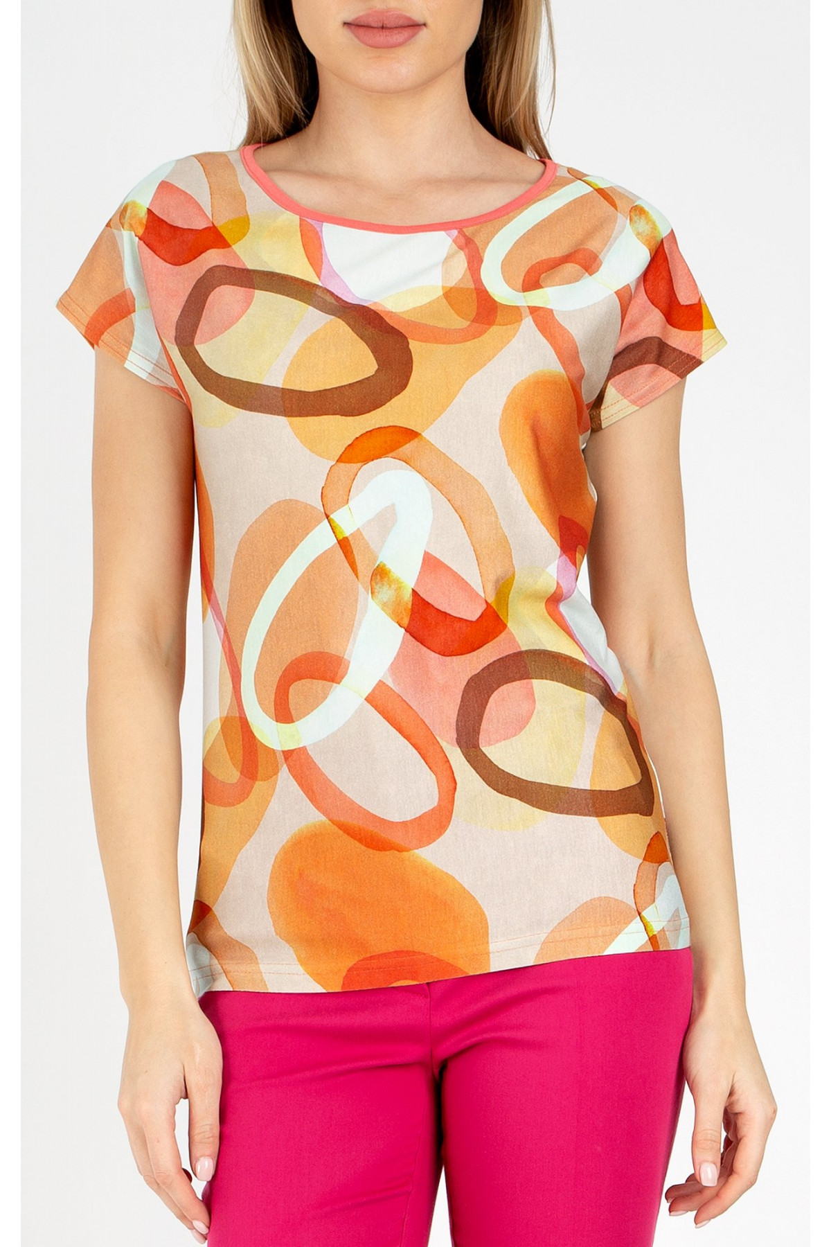 Bluză cu siluetă lejeră și imprimeu grafic într-o gamă modernă de Orange. Bluza este confecționată dintr-un material de tricot, partea de sus este lejeră, iar partea de jos este mulată, decolteu tip barcă și mânecă scurtă căzută. Croiala comodă este o alegere excelentă pentru viața de zi cu zi, iar desenul modern reflectează individualitatea și stilul dumneavoastră. Această bluză este disponibilă în mărimile de la S până la 4XL.