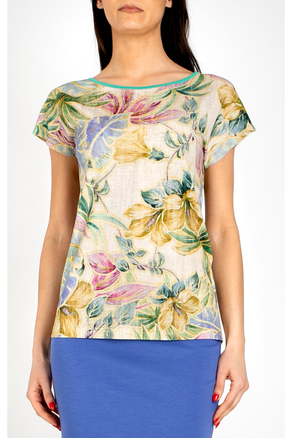 Bluză din tricot moale, în culoarea bej nisipiu, cu motive florale în nuanțe delicate de roz, lavandă și turcoaz. Modelul are siluetă lejeră, cu umăr căzut și decolteu tip bărcuță finisat cu tiv contrastant verde. Materialul ușor și croiala relaxată o fac potrivită pentru un stil de viață dinamic, oferind confort pe tot parcursul zilei.