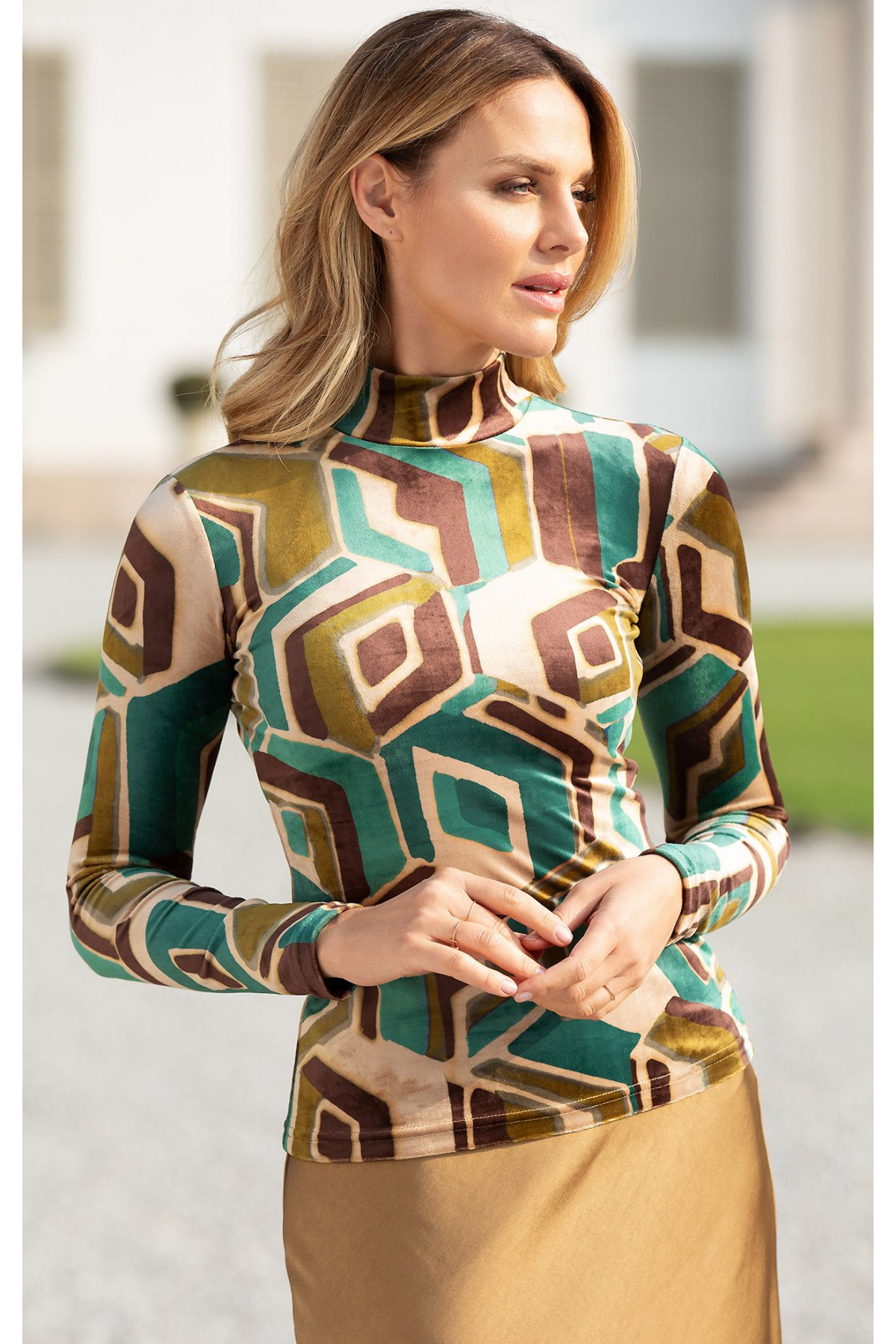 Bluză din catifea moale, cu desen grafic în culorile Antique Green, Olive și Coffee Brown pe fond bej