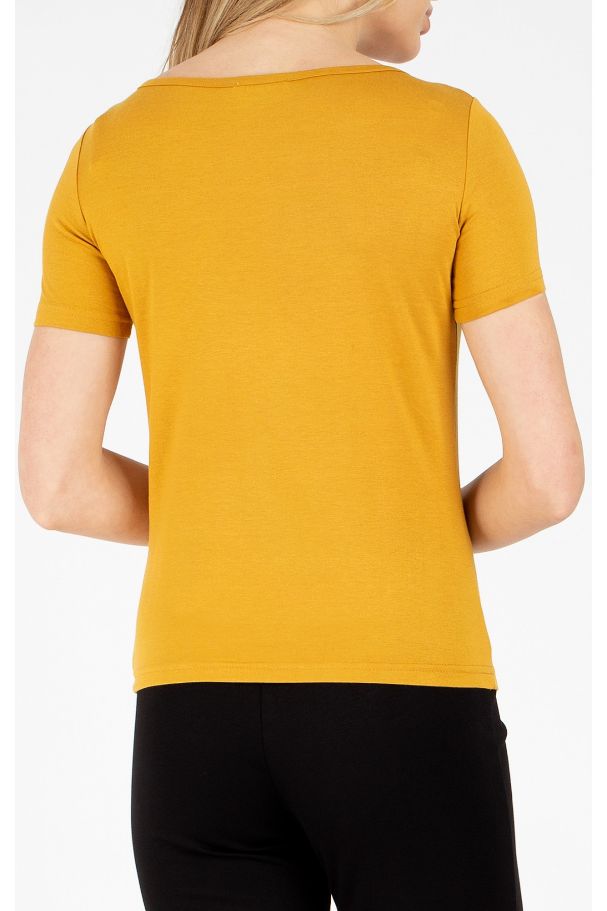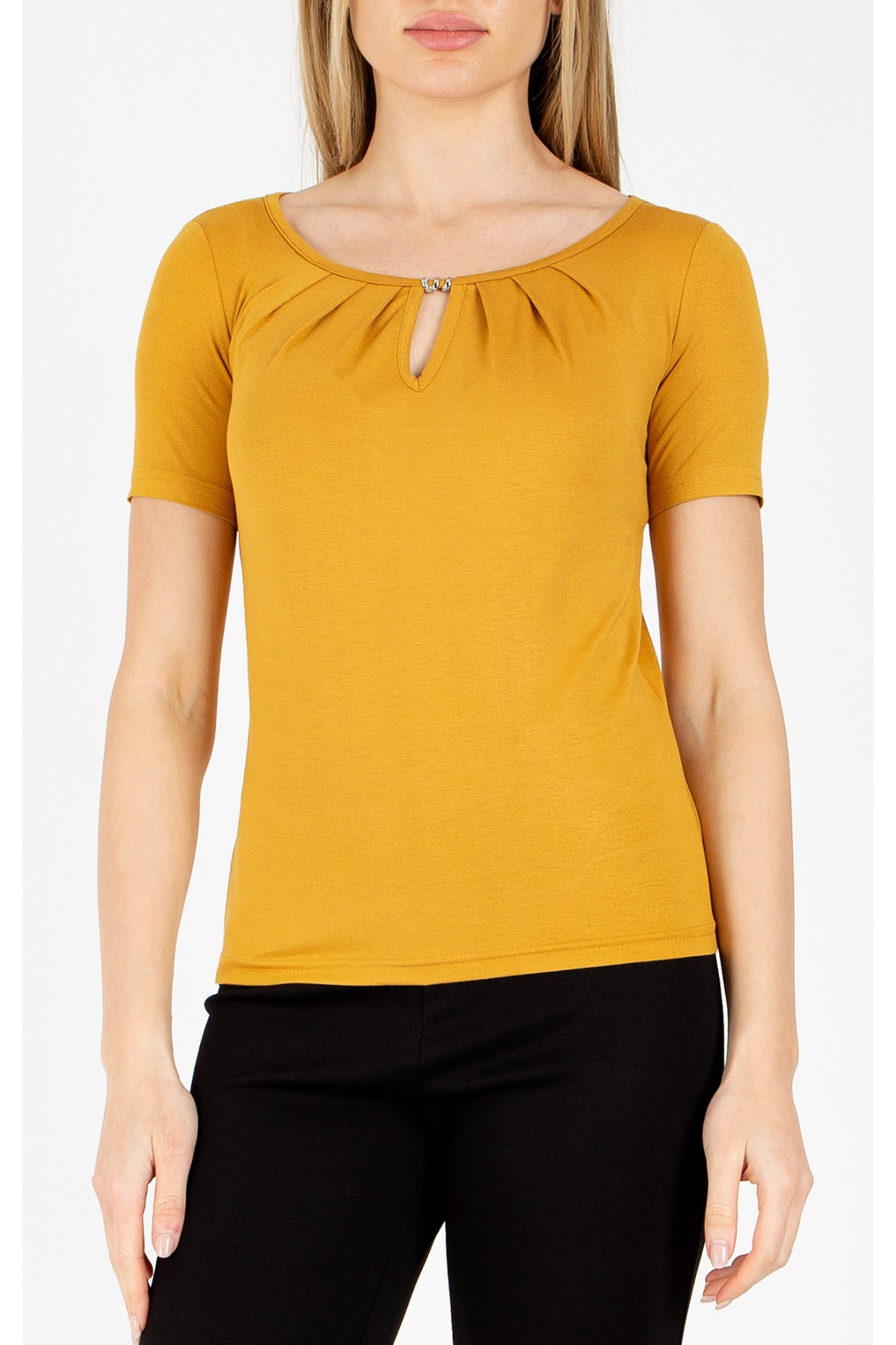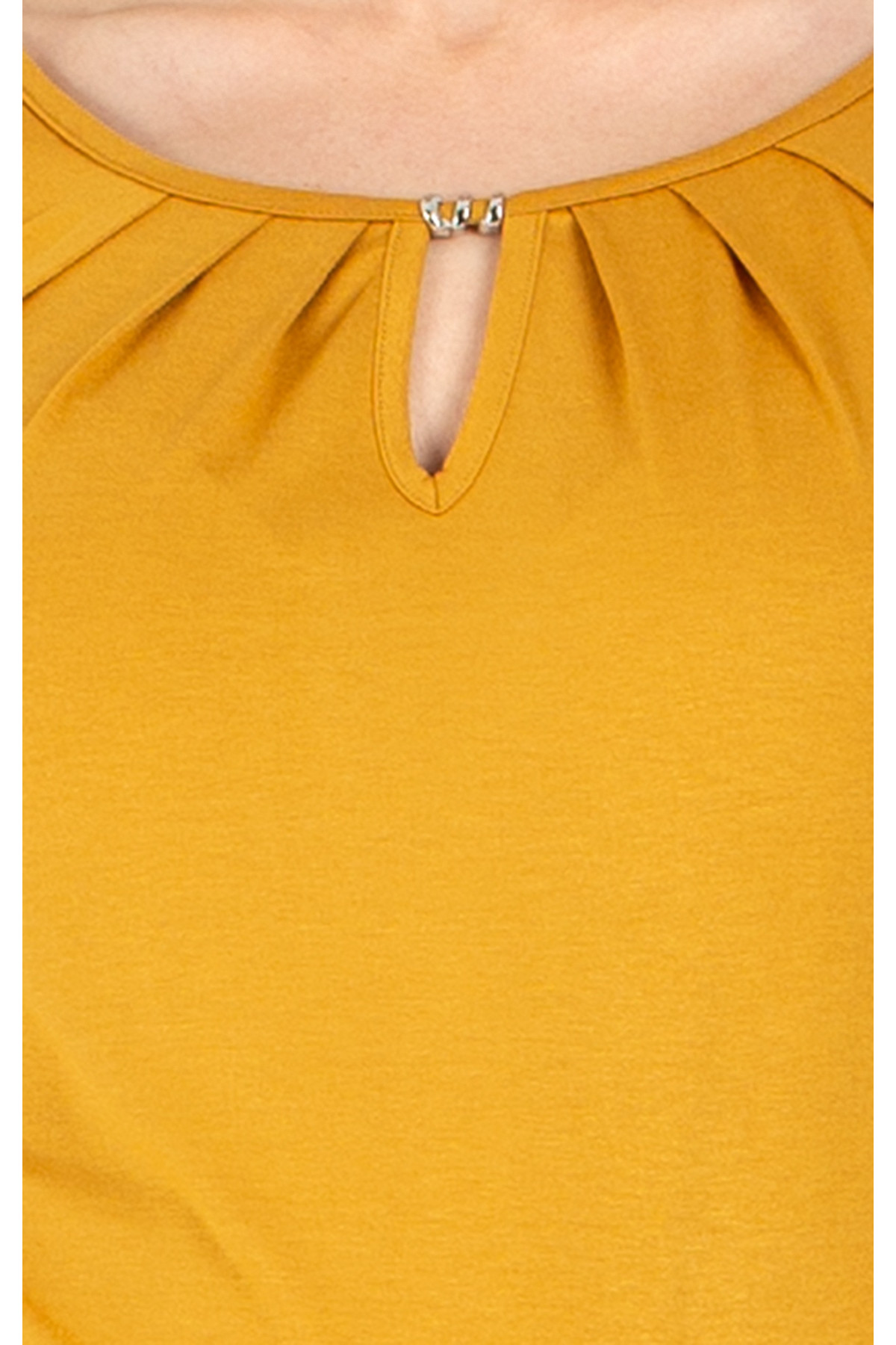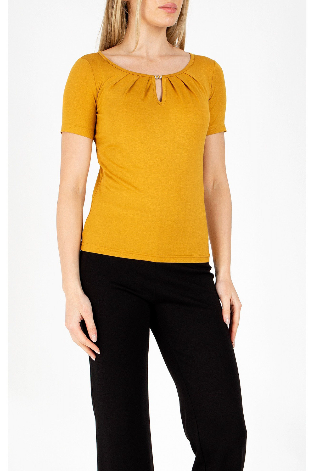 Bluză din jerseu elastic cu pliuri și decupare pe decolteu de culoare Honey Gold. Modelul bluzei are siluetă lejeră, decolteu tip barcă cu pliuri cu decupare mică și element metalic, mânecă scurtă. Designul atractiv este potrivit atât pentru ieșirile ocazionale, cât și pentru birou. Combinați ușor cu fuste și pantaloni de stil diferit și în funcție de ocazie. Bluza este confecționată în mărimile de la 34 până la 48.