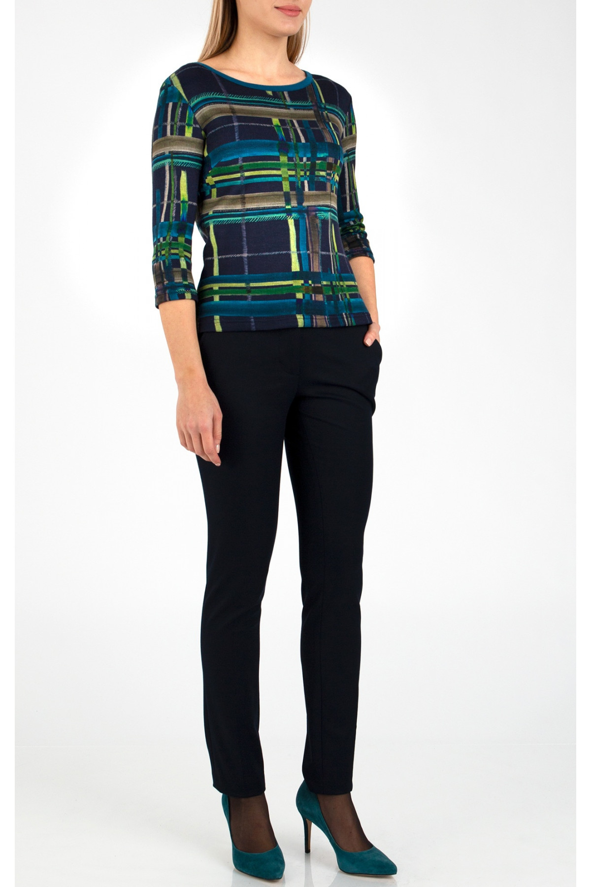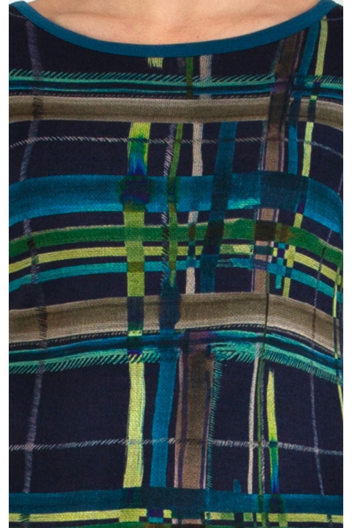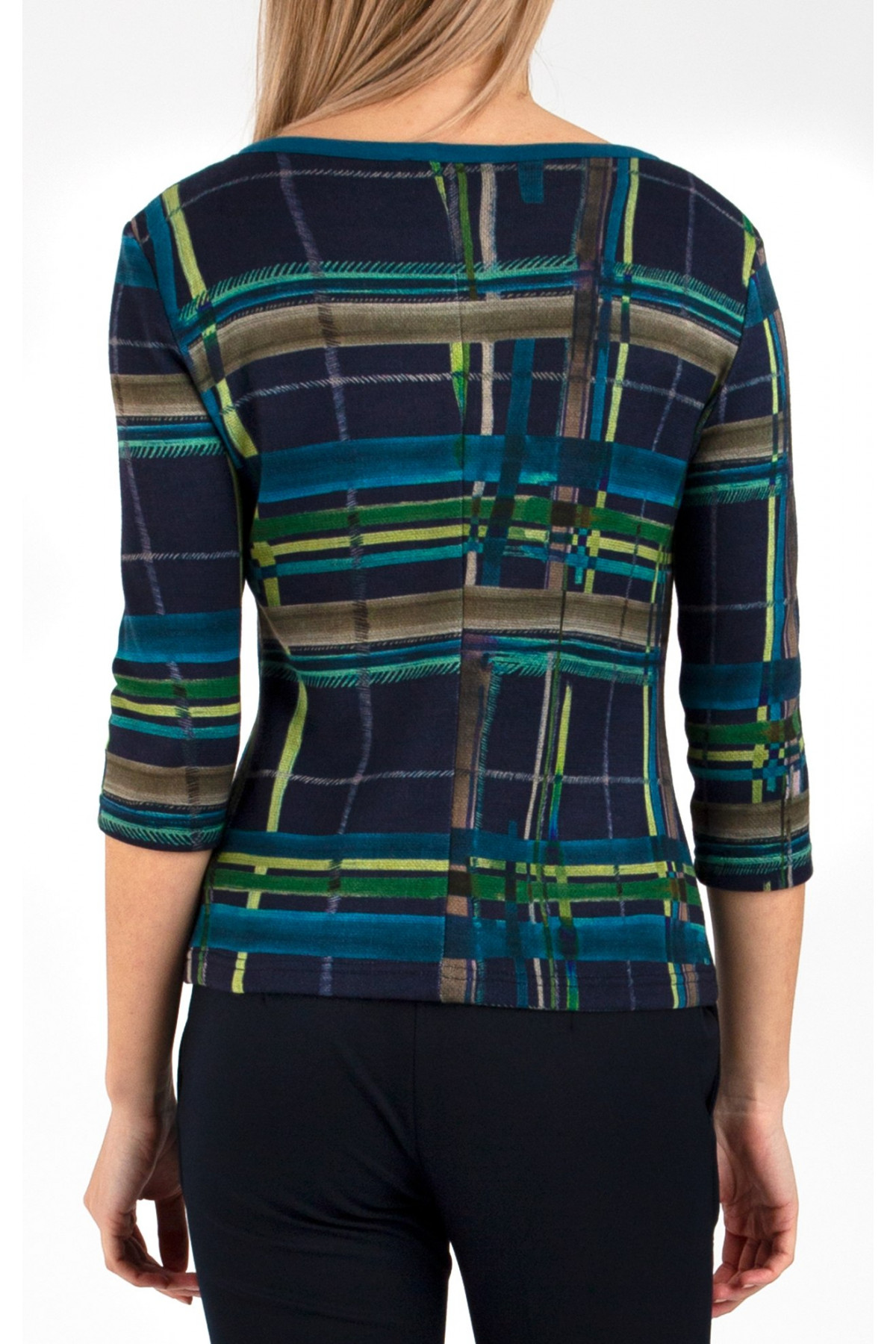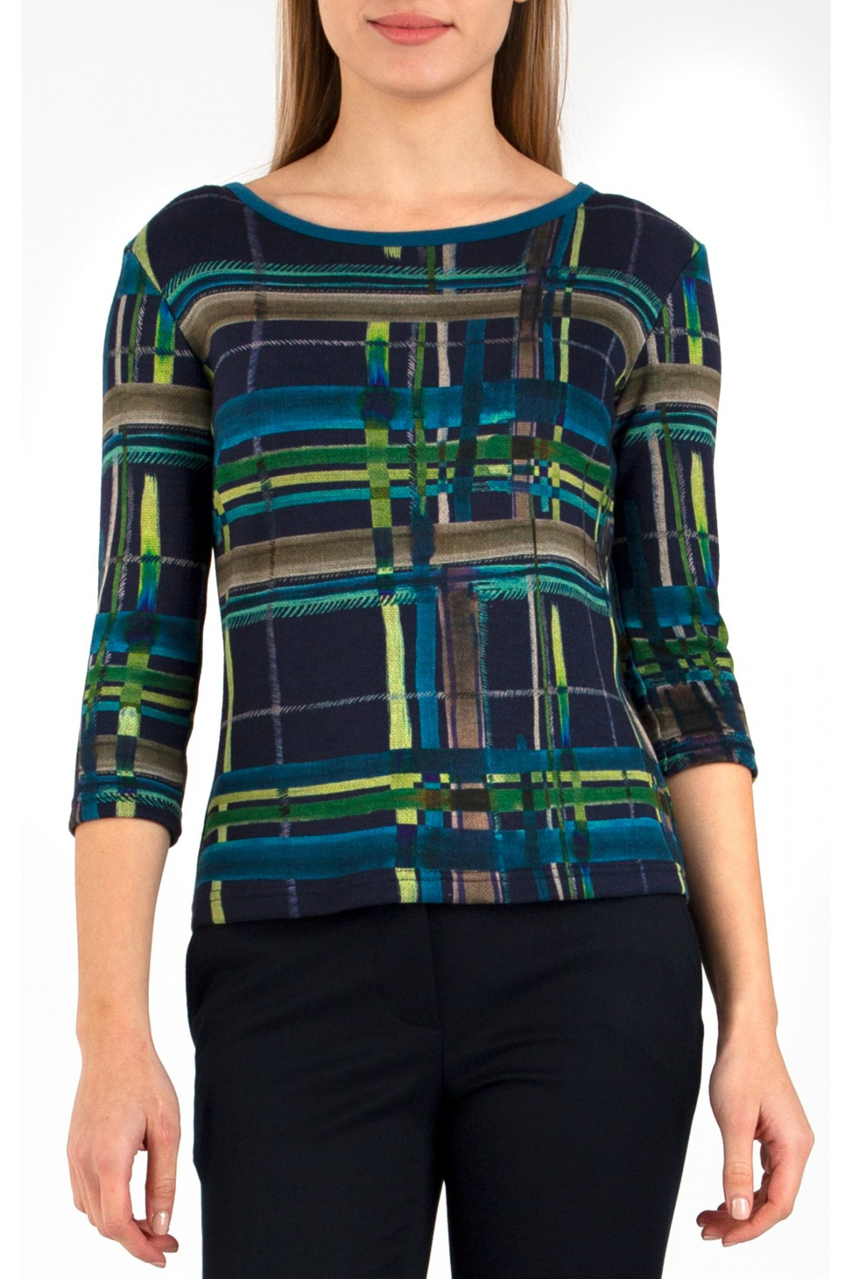 Bluză din tricot luxos, în frumos imprimeu grafic pe o bază albastră. Modelul are mânecă 3/4 si decolteu tip barca - accentuat cu bie de contrast.