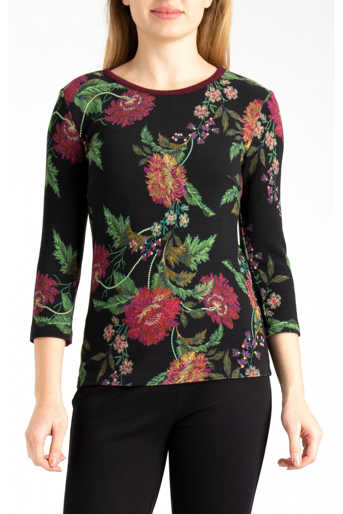 Bluză din materie tricot de lux, cu print atractiv cu motive florale Modelul are mâneci ¾ și decolteu tip barcă cu bie subliniat în culoarea bordo.