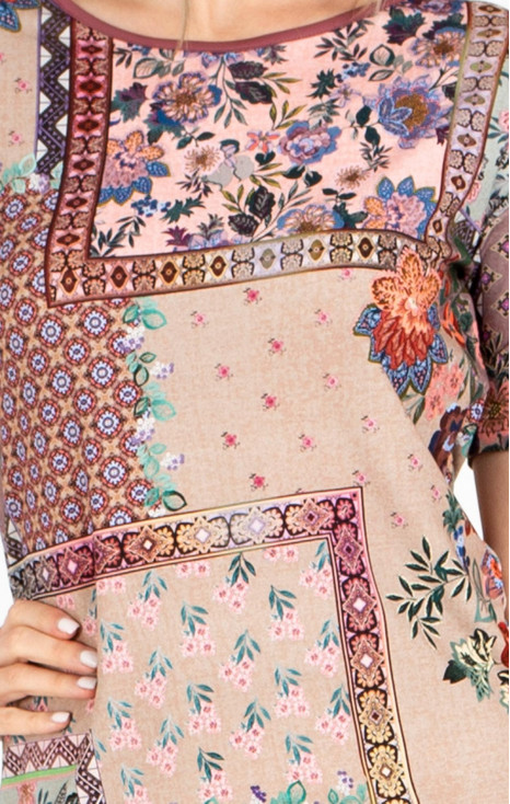 Bluză din tricot ușor cu imprimeu patchwork de culoare Nostalgia Rose. Aceasta este confecționată dintr-o țesătură tricotată din viscoză cu un model bogat într-o paletă de culori delicate, mânecă lungă și decolteu tip barcă. O bluză comodă potrivită pentru viața de zi cu zi, aducând o stare de spirit plăcută și colorată. Bluza este confecționată în mărimile de la S până la 4XL.
