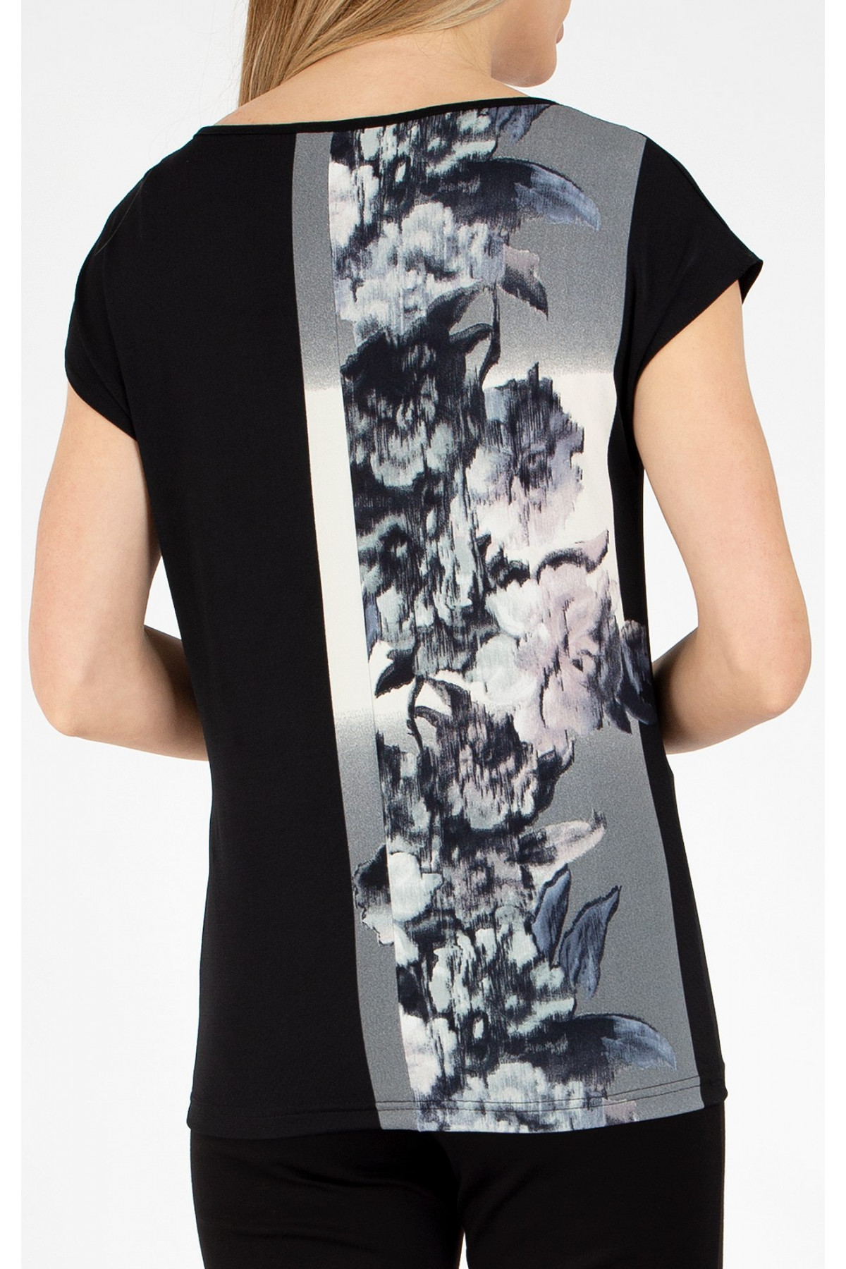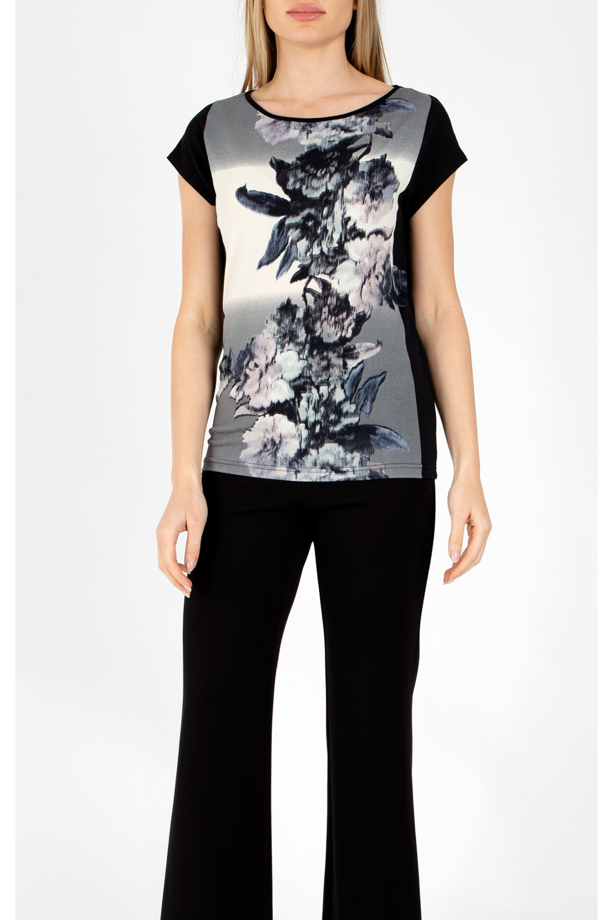 Bluză din tricot ușor tip jerseu cu imprimeu floral alb-negru. Un model universal potrivit pentru orice tip de siluetă, partea de sus lejeră și ușor mulată în partea de jos, cu decolteu tip barcă și mânecă scurtă căzută. Aceasta este potrivită pentru a obține diferite aspecte. Combinați cu o fustă sau pantaloni din colecția Daphne. Bluza este confecționată în mărimile de la S până la 2XL.
