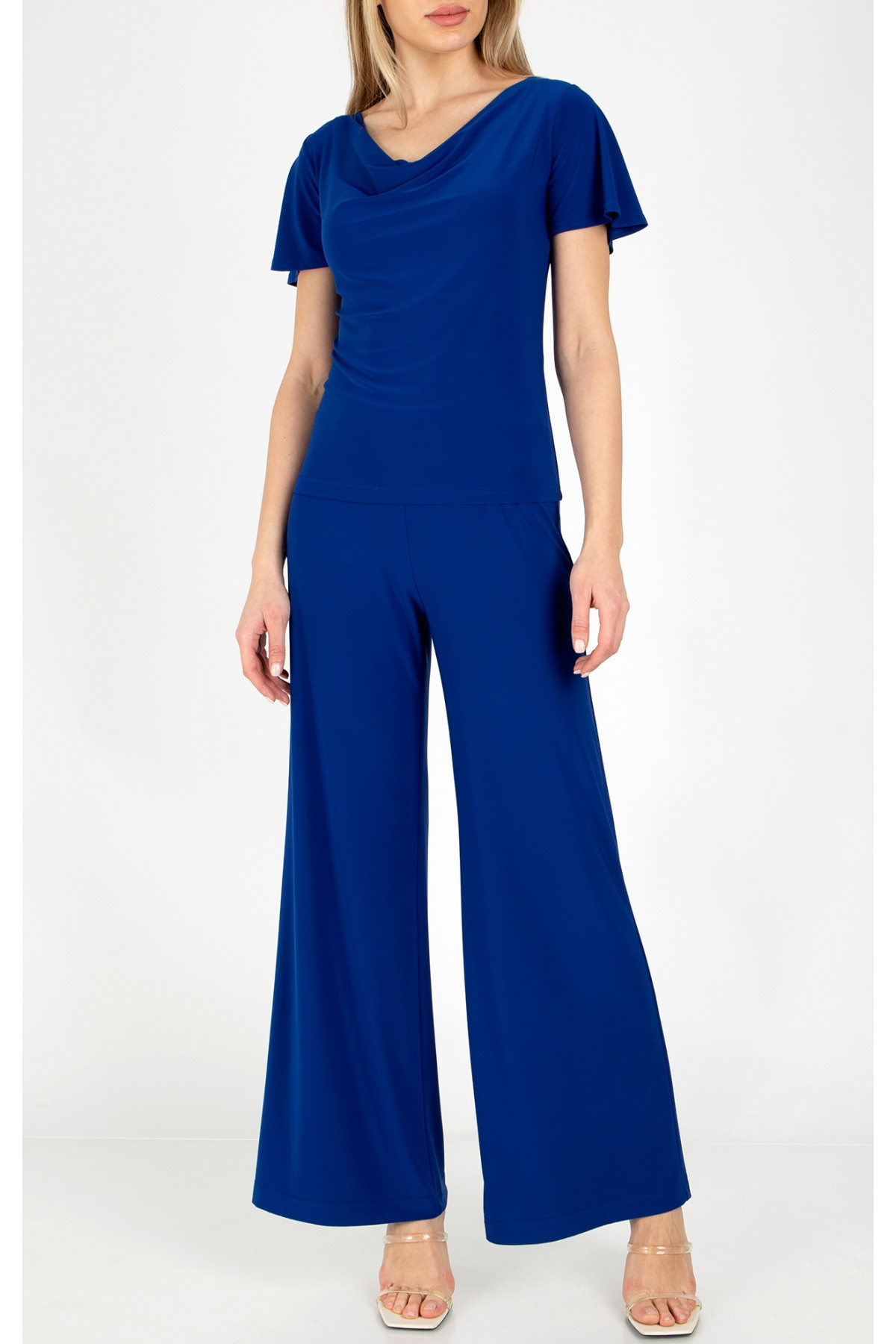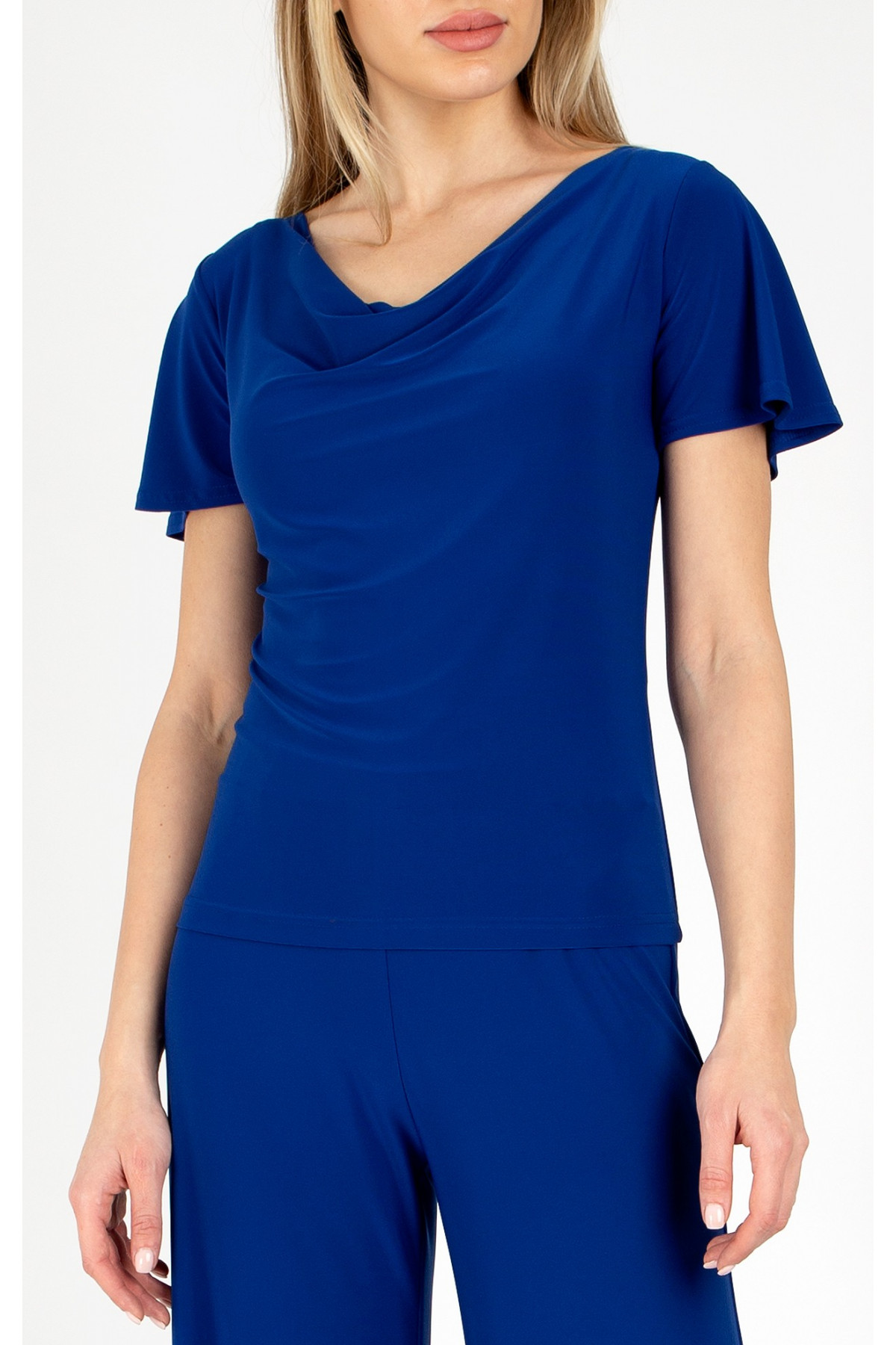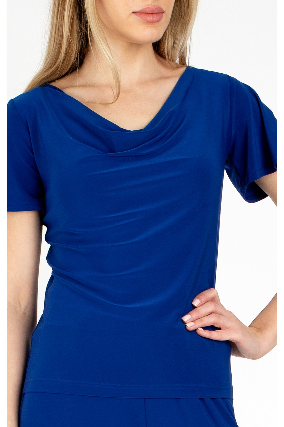 Bluză elegantă cu decolteu drapat și mânecă scurtă de culoare Ultamarine. Modelul bluzei este confecționată dintr-un material de tricot moale tip jerseu. O bluză comodă pe care o puteți purta în viața de zi cu zi sau sub sacou la birou. Se combină ușor cu fuste și pantaloni din colecția Daphne.