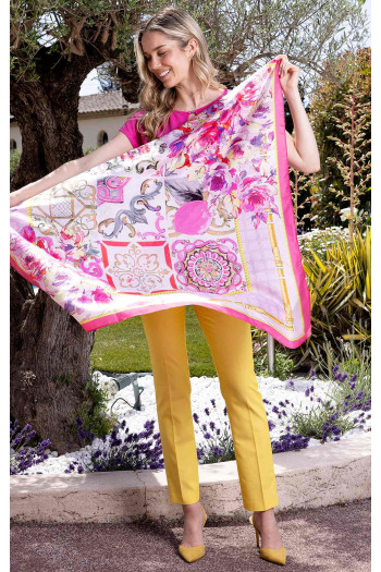 Bluză elegantă cu siluetă lejeră, umăr căzut și decolteu rotund. Aceasta este confecționată dintr-un tricot de lux, moale și plăcut la atingere, de culoare roz - Shocking Pink. Modelul bluzei are decolteu rotund cu o decupare în formă de picătură pe partea din față și element metalic decorativ. Aceasta este potrivită pentru oricine, și se poate asorta cu diverse stiluri de fuste și pantaloni pentru orice ocazie.
