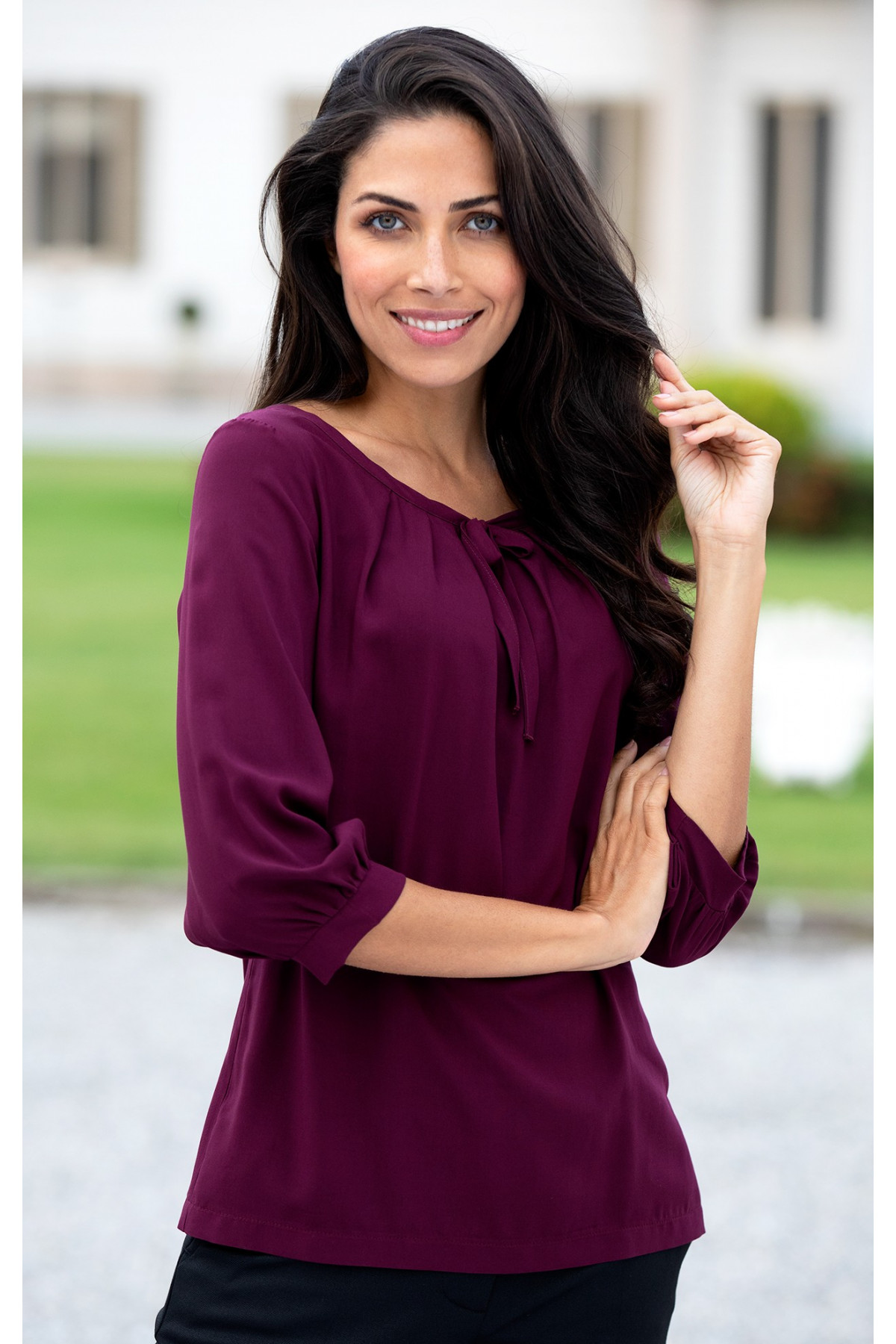 Bluză elegantă într-o siluetă lejeră din viscoză visiniu. Modelul are un decolteu barca cu cute delicate, completat cu șirit.