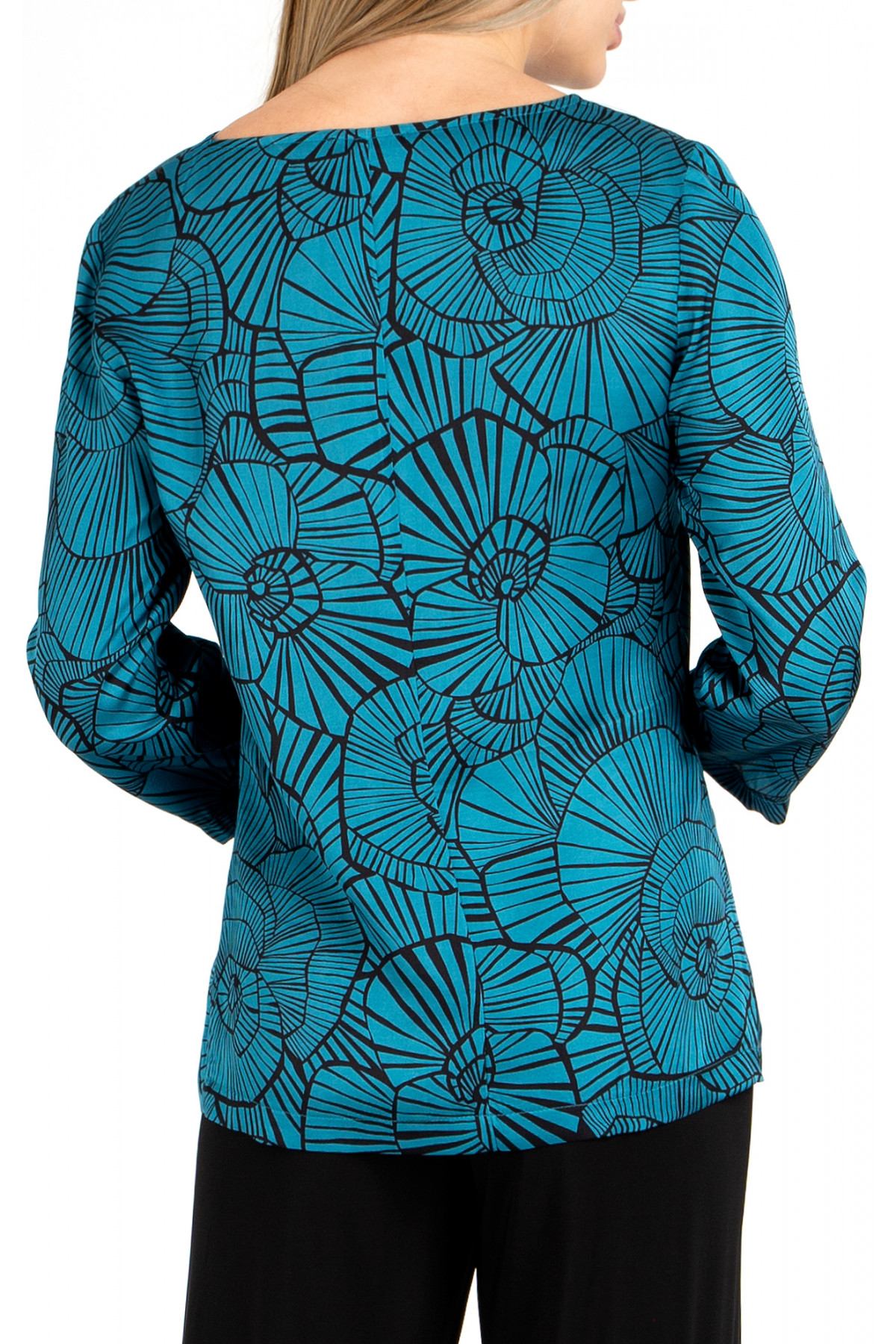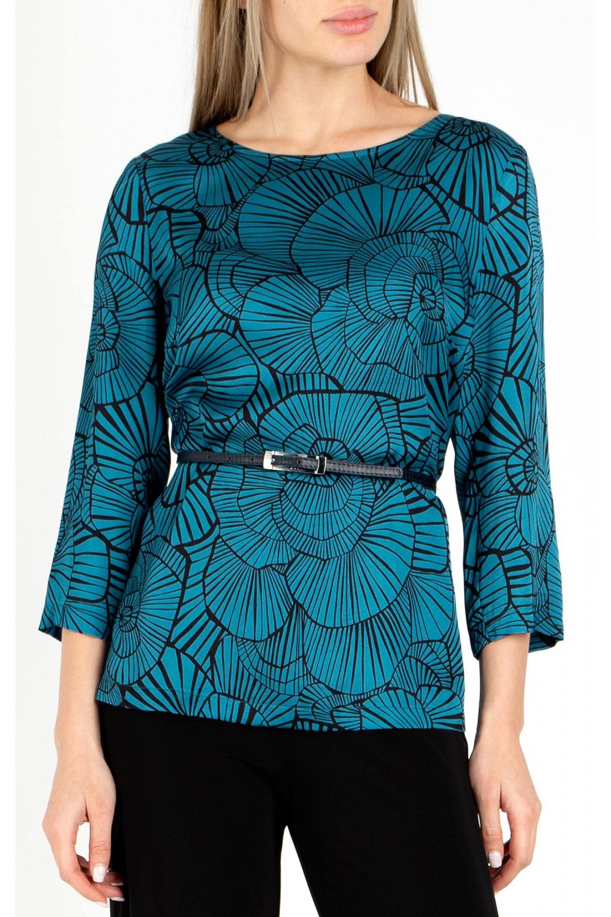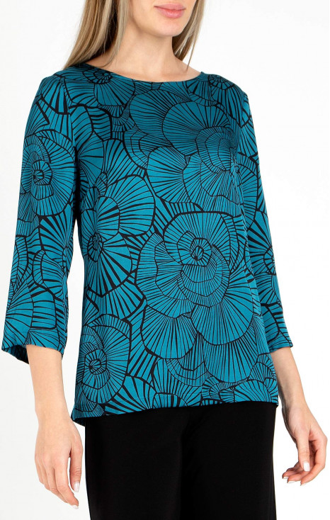 Bluză elegantă dintr-un material satinat fin, de culoare Blue Moon cu imprimeu negru grafic. Modelul bluzei este confecționat din viscoză luxoasă de înaltă calitate, într-o siluetă lejeră, cu mânecă 3/4 și decolteu tip barcă. Puteți sublinia talia cu o curea din piele naturală, disponibilă în mai multe culori din colecția noastră sau s-o purtați lejeră. Această bluză este disponibilă în mărimile de la 36 până la 50.