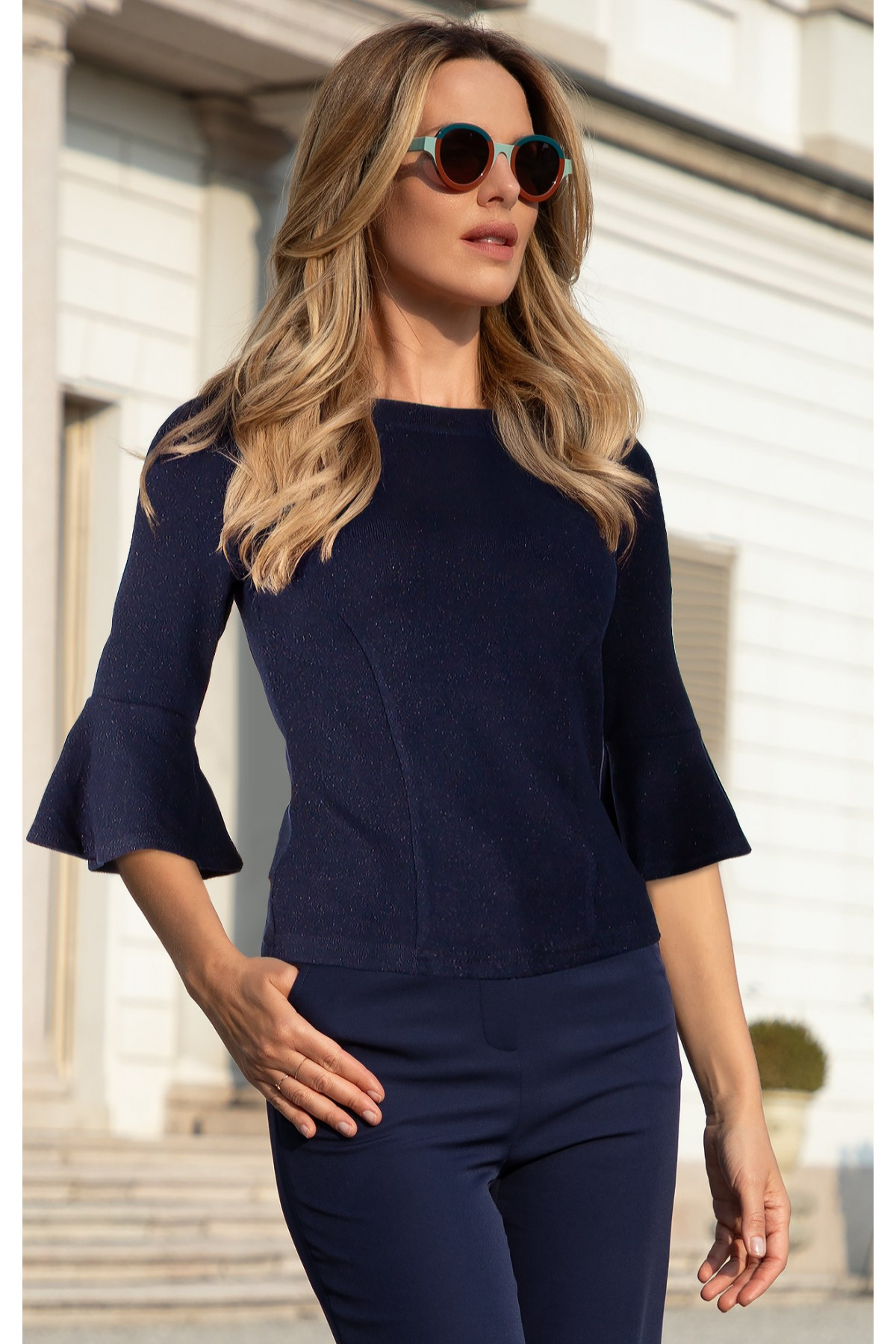 Delicată și feminină, realizată din tricot elastic în nuanța Maritime Blue, cu fire fine strălucitoare care conferă un aspect luxos. Modelul are croială ușor cambrată și mâneci 3/4 cu volane. O bluză fină și elegantă – alegere excelentă atât pentru ocazii speciale, cât și pentru ținute stilate de zi cu zi.
