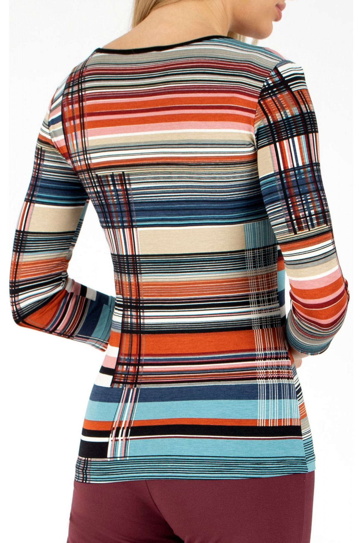 Bluză mulată cu decolteu în formă de V, cu dungi colorate dinamice. Modelul bluzei este confecționat dintr-un jerseu ușor, mânecă 3/4 și decolteu în formă de V, subliniat cu o bordură neagră. Țesătura elastică garantează confort pe tot parcursul zile, iar imprimeul modern aduce o atmosferă colorată. Bluza este disponibilă în mărimile de la 36 până la 44.