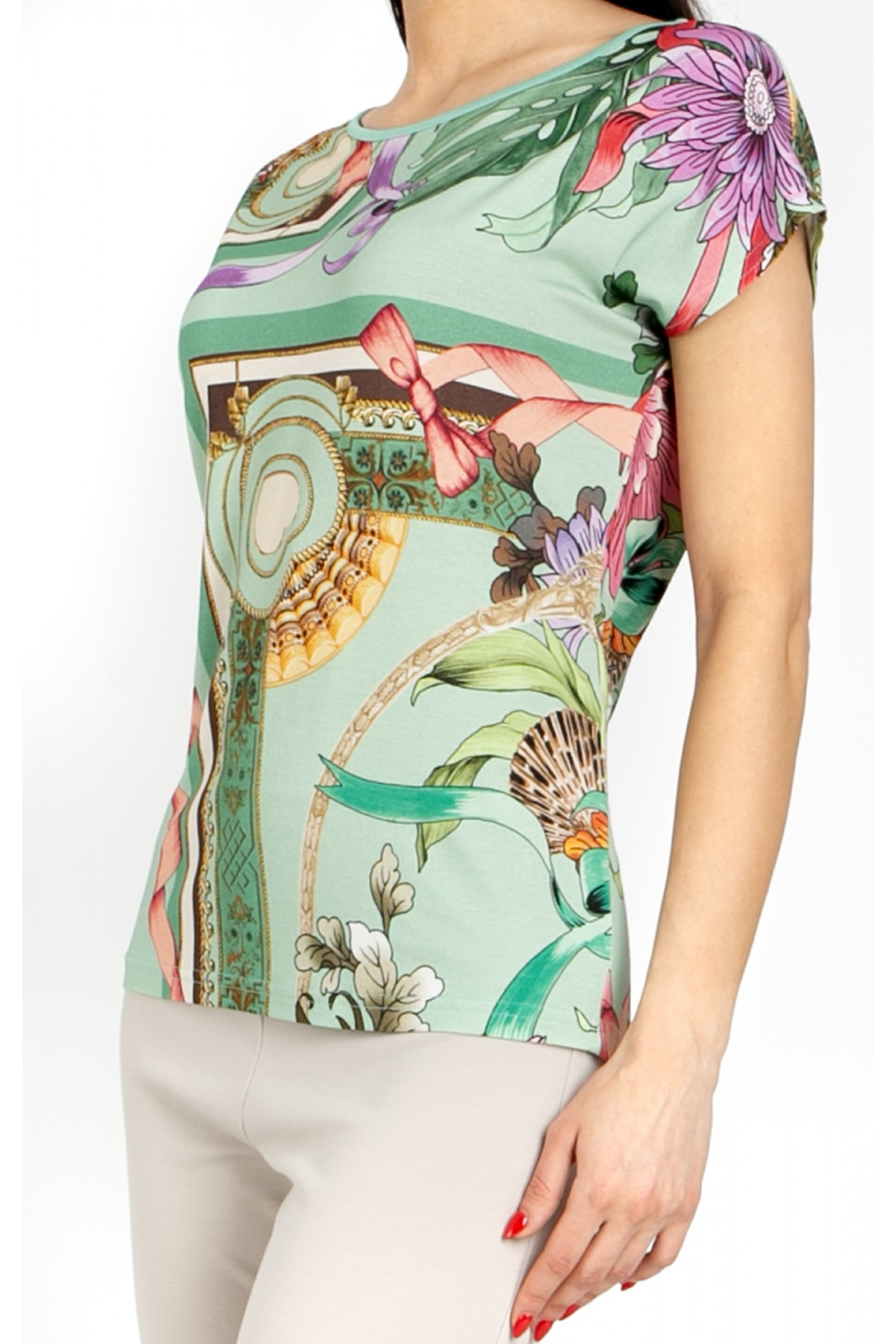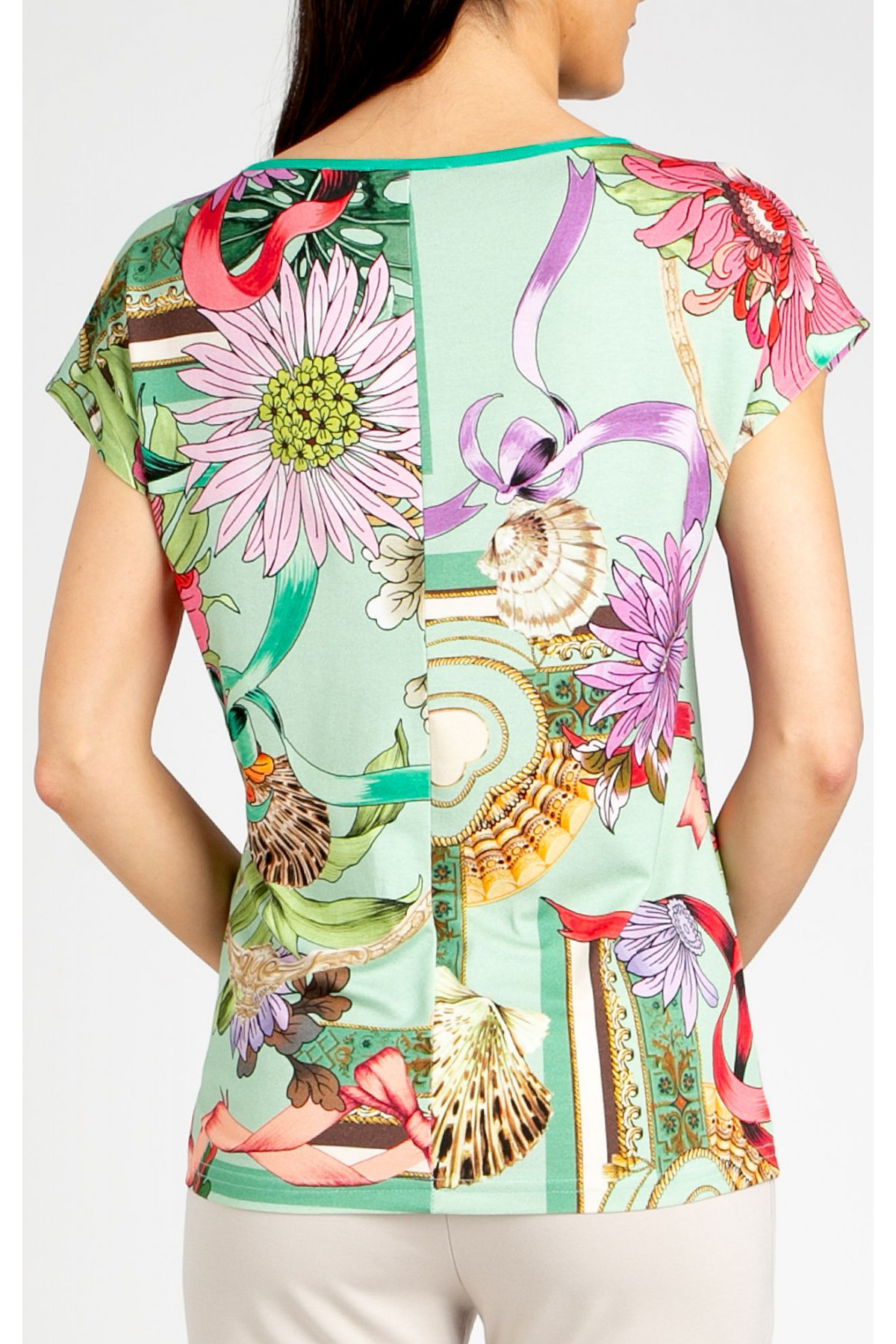 Bluză în culoarea Aqua Green, cu imprimeu baroc și motive florale. Modelul are siluetă lejeră, cu umăr căzut și decolteu tip bărcuță finisat cu tiv. Este realizată într-un print bogat cu crizanteme delicate în nuanțe de mov și roz, combinate cu ornamente fine, funde și elemente marine. Baza verde proaspătă oferă modelului o senzație de lejeritate și un aer primăvăratic.