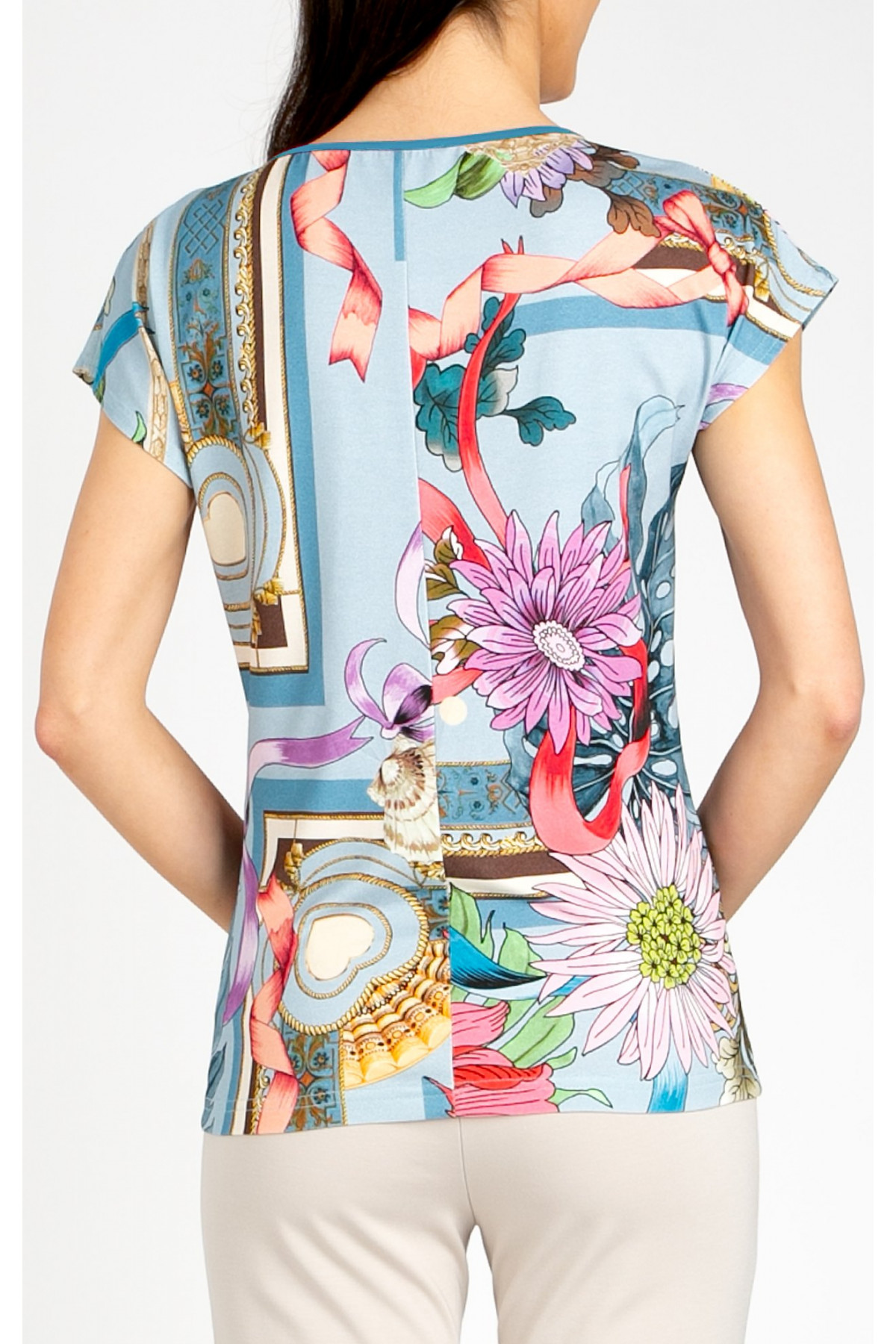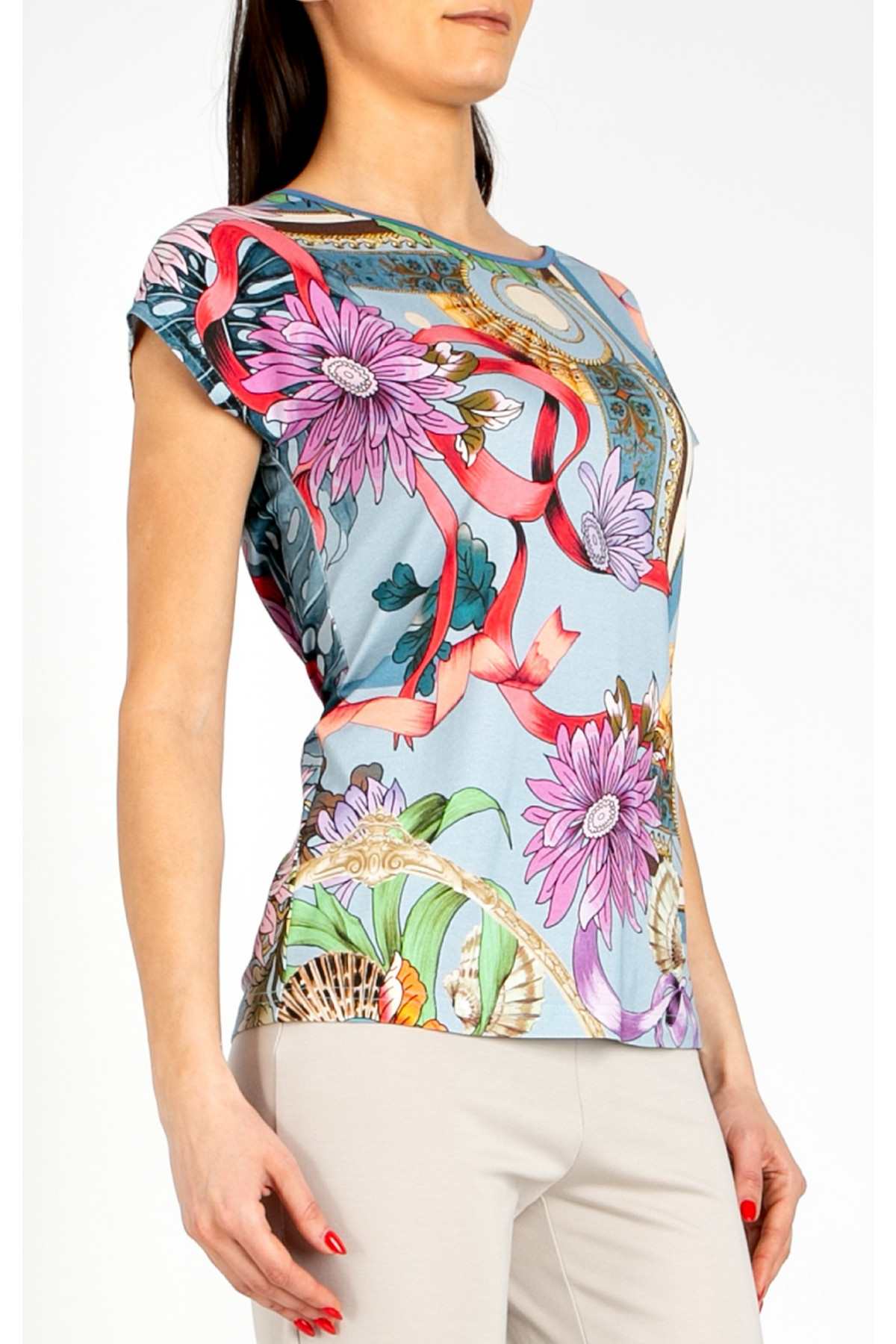 Bluză în culoarea Baby Blue, cu imprimeu baroc și motive florale. Modelul are siluetă lejeră, cu umăr căzut și decolteu tip bărcuță finisat cu tiv. Este realizată într-un print bogat cu crizanteme delicate în nuanțe de mov și roz, combinate cu ornamente fine, funde și elemente marine. Baza bleu deschis conferă modelului o senzație de lejeritate și un aer proaspăt de primăvară.