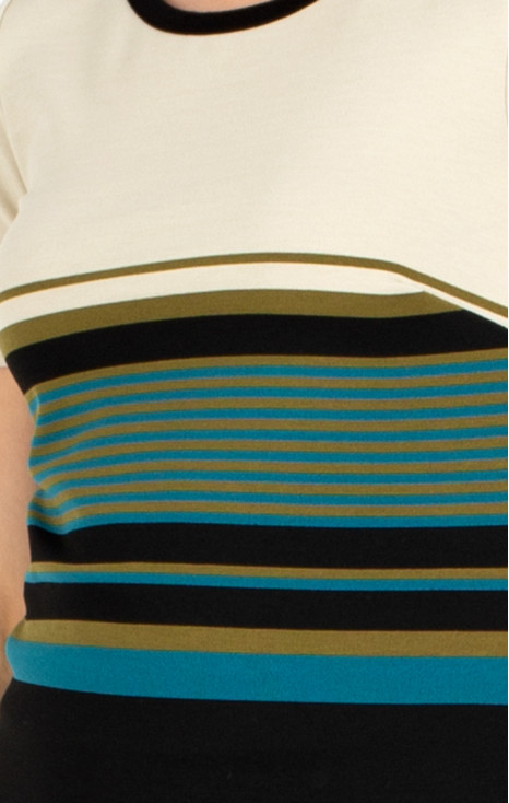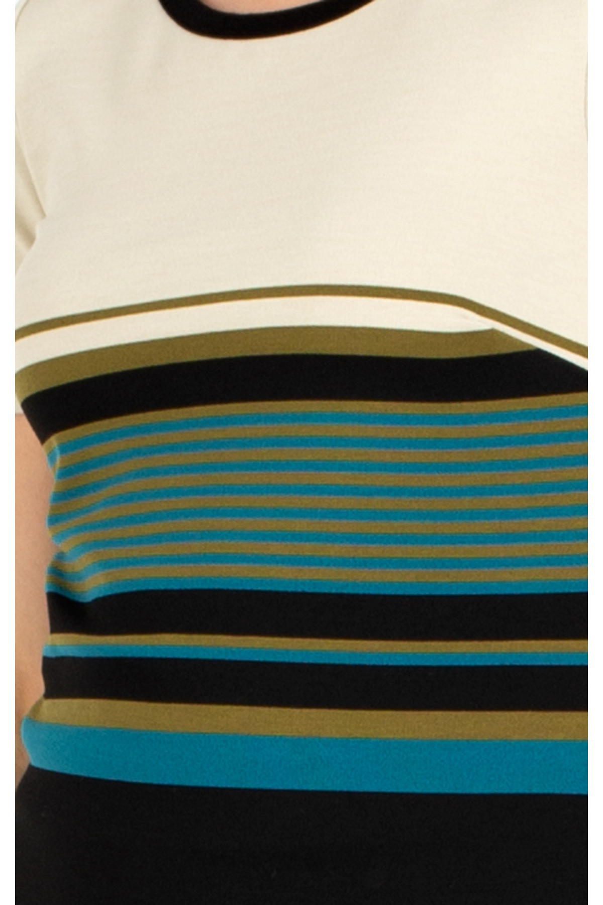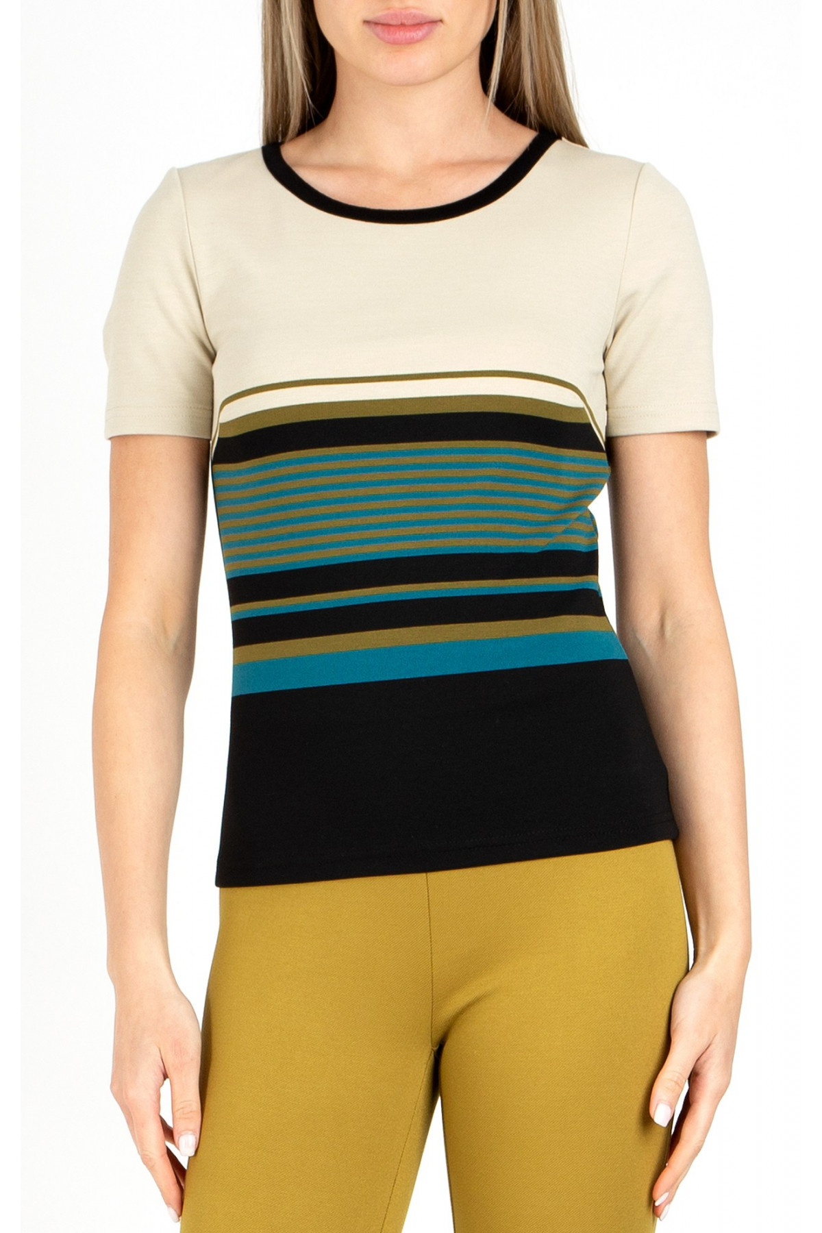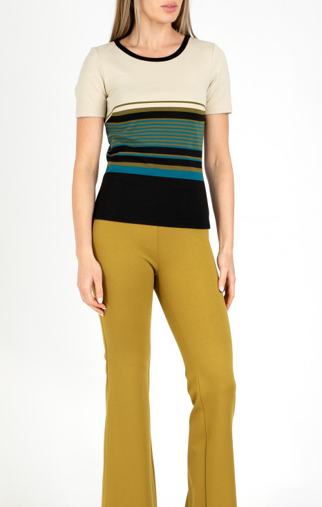 Bluză spectaculoasă cu dungi colorate dinamice. Modelul bluzei este cu mânecă scurtă și decolteu tip barcă, subliniat de o bordură neagră contrastată. Bluza este confecționată dintr-un material tricotat ajustat de culoare bej nisipos și negru în combinație cu dungi colorate dinamice. Aceasta este potrivită pentru birou sau întâlniri de afaceri. Bluza este disponibilă în mărimile de la 36 până la 44.