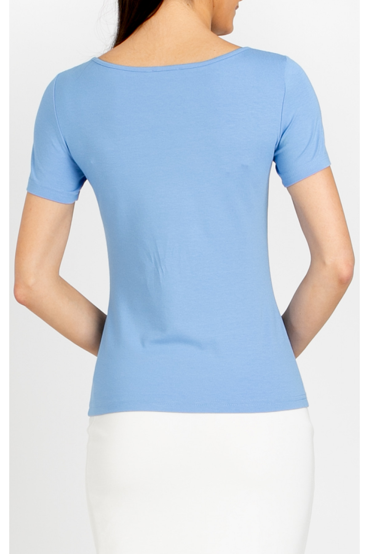 Bluză elegantă cambrată din tricot, cu inserție din dantelă, în culoarea Sky Blue. Modelul este realizat dintr-un material tricotat ușor, în nuanță bleu deschis. Are siluetă cambrată, mânecă scurtă, inserție din dantelă și decolteu tip bărcuță. Bluza este versatilă și potrivită atât pentru ținute office, cât și pentru combinații elegante de zi sau de seară.