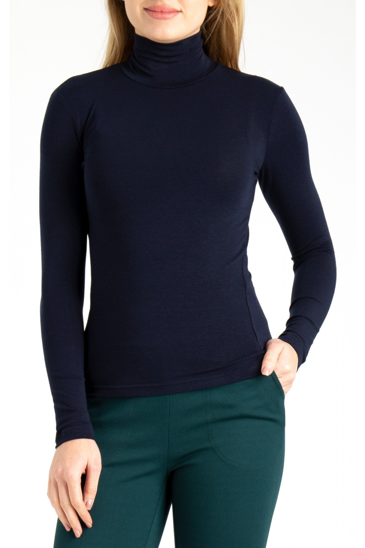 Bluză stilată ci guler înalt polo din tricot moale de albastru cerneală