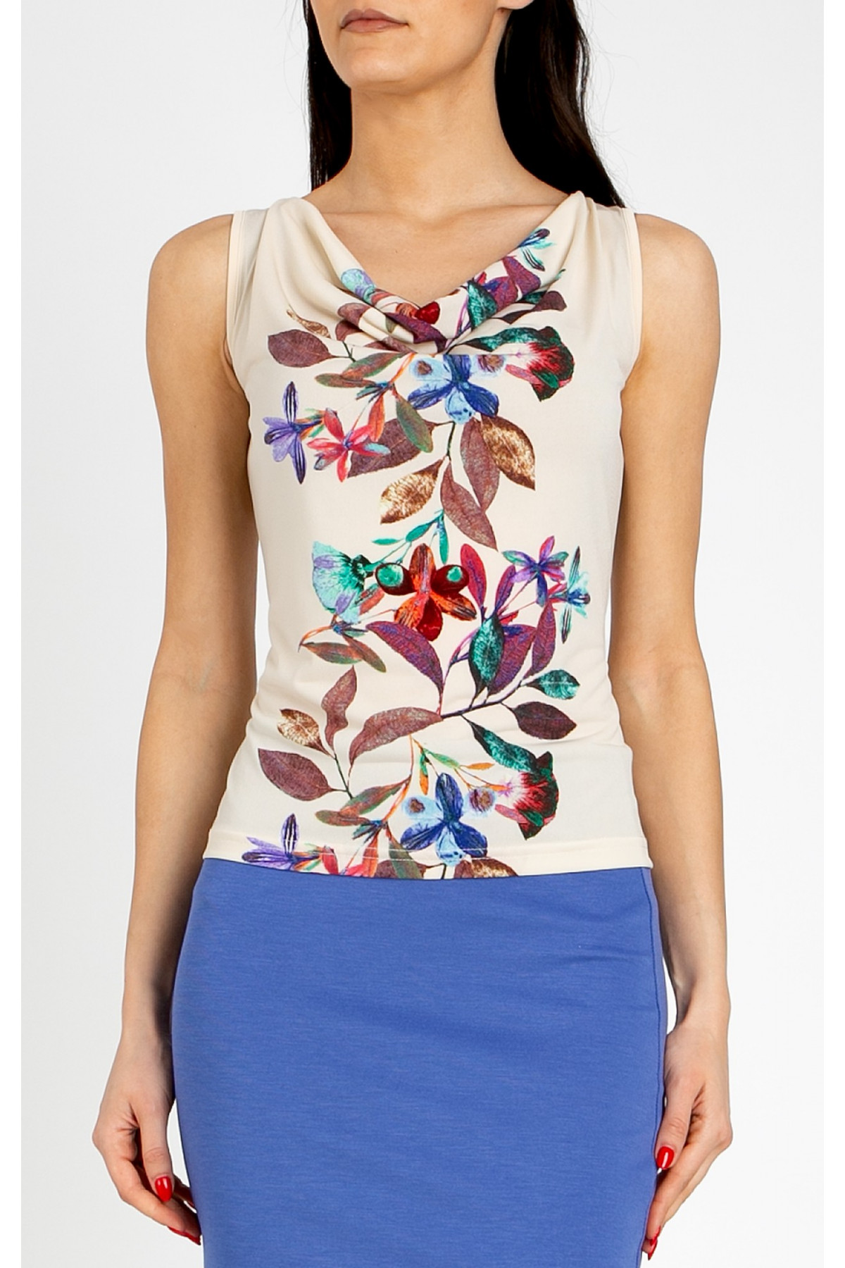 Bluză stilată cu decolteu drapat, în culoarea Vanilla Ice, cu bordură florală verticală care alungește vizual silueta. Modelul este cambrat, fără mâneci, cu un decolteu drapat spectaculos ce evidențiază frumos gâtul, realizat din tricot elastic tip jerseu. Un model versatil, ușor de combinat cu sacouri, fuste sau pantaloni – alegerea ideală pentru un look urban contemporan.