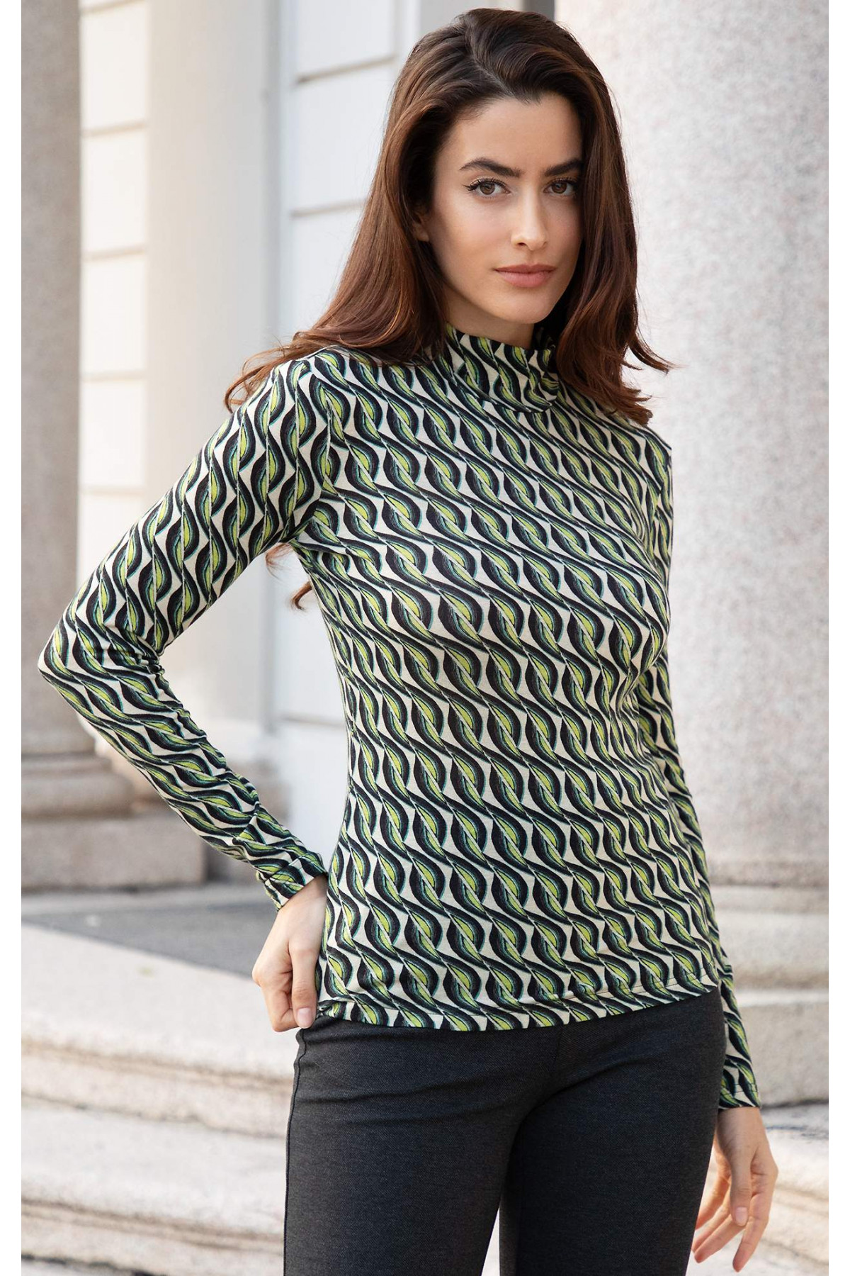 Bluză tricotată călduroasă, cu guler tip helancă și model grafic în culorile Carbon și Wild Lime
