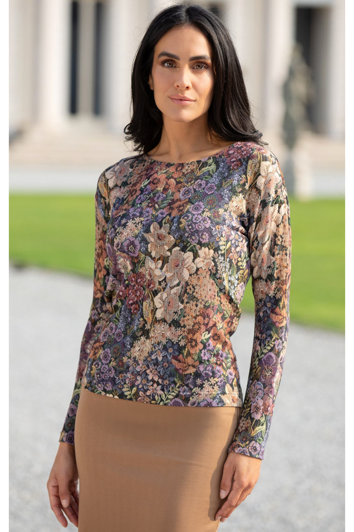 Bluza cu croială lejeră, cu imprimeu floral bogat în stil „Tapestry” în nuanțe liliachii cenușii și tonuri armonioase pământii.