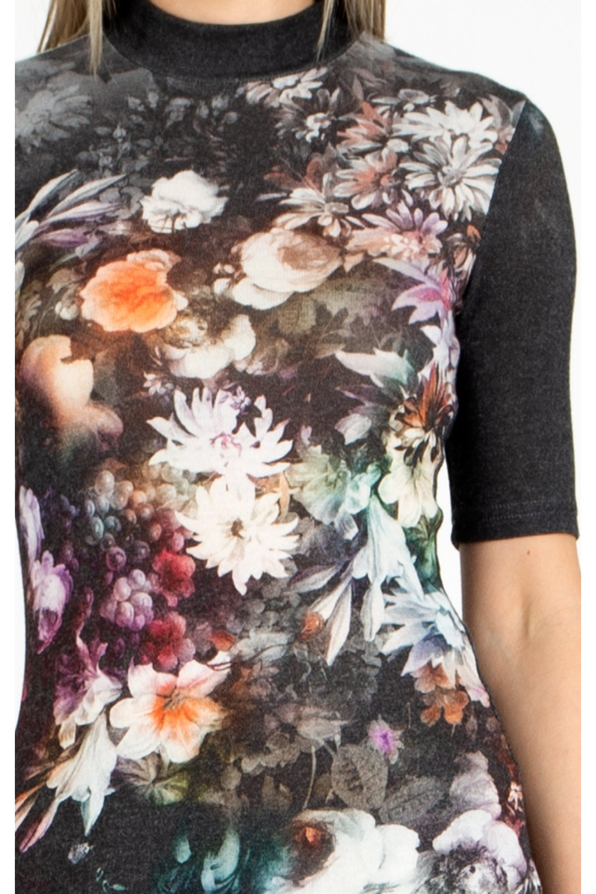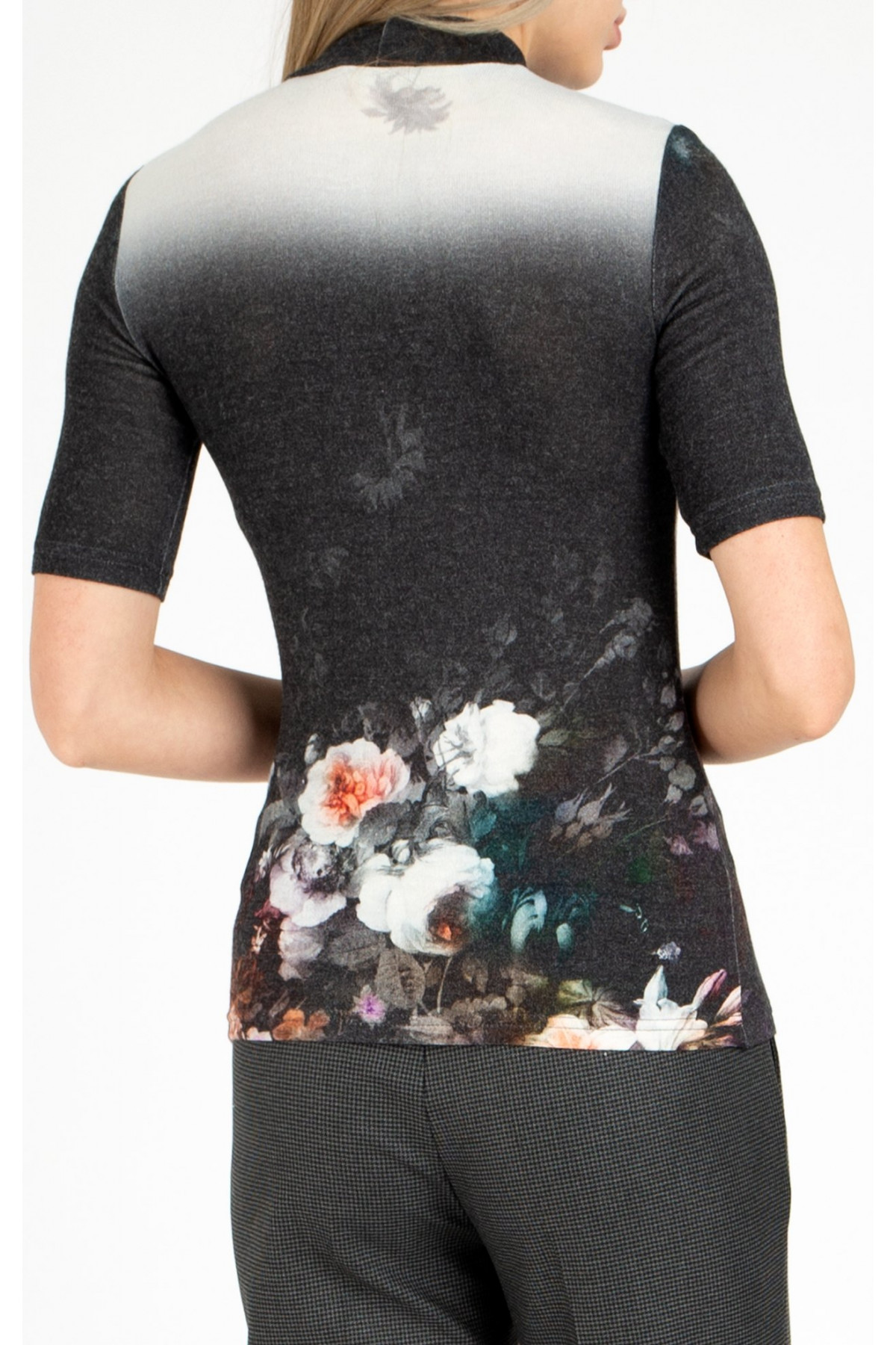 Bluza este confecționată dintr-un tricot extrem de moale la atingere, oferind confort, feminitate și eleganță. Imprimeul floral surprinde un contrast magic, cu nuanțe ce trec de la gri închis spre tonuri delicate de gri deschis. Modelul are guler polo scurt și mâneci scurte, fiind potrivit atât pentru birou, cât și pentru ținutele casual. Se poate asorta ușor cu fuste sau pantaloni din colecția de toamnă-iarnă Daphne.