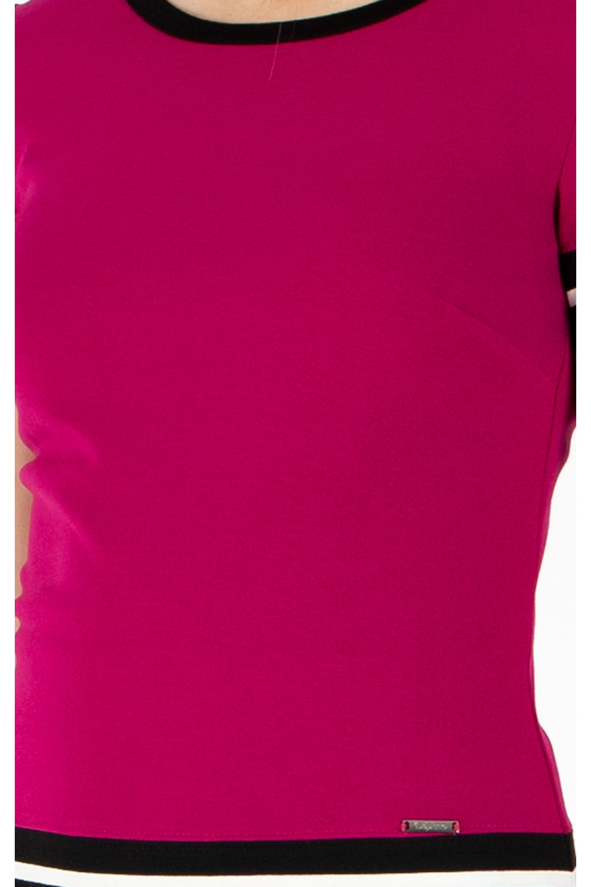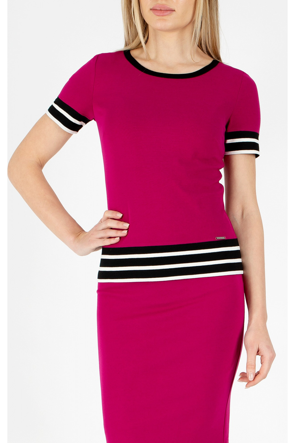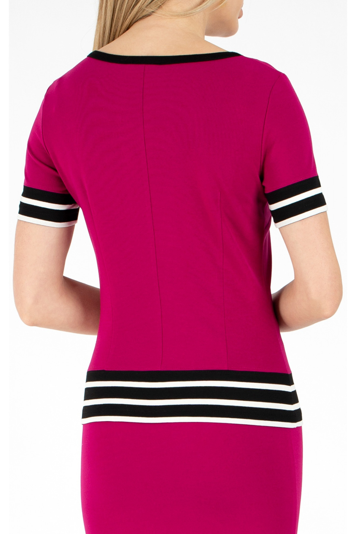 Bluză dintr-un material de tricot ajustat de culoare Fuchsia Rose cu dungi albi și negri. Modelul bluzei are decolteu închis cu bordură neagră, cu mânecă scurtă și dungi spectaculoase pe mâneci și șolduri. Țesătura elastică netezește și modelează silueta. O alegere excelentă pentru birou sau aspectul dumneavoastră sport-elegant. Bluza este disponibilă în mărimile de la 36 până la 46.