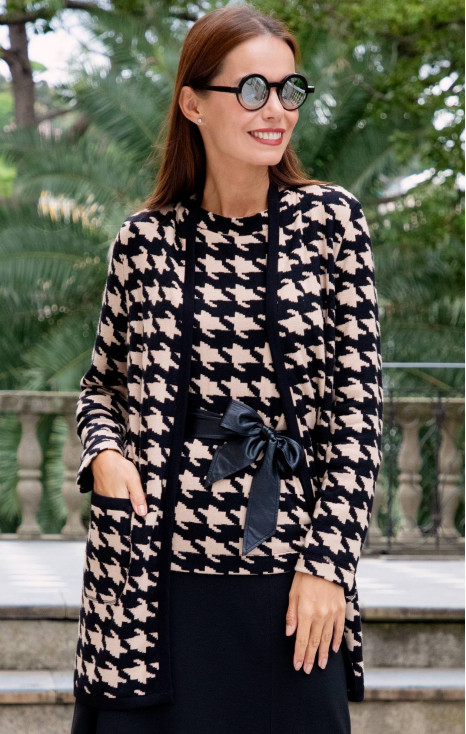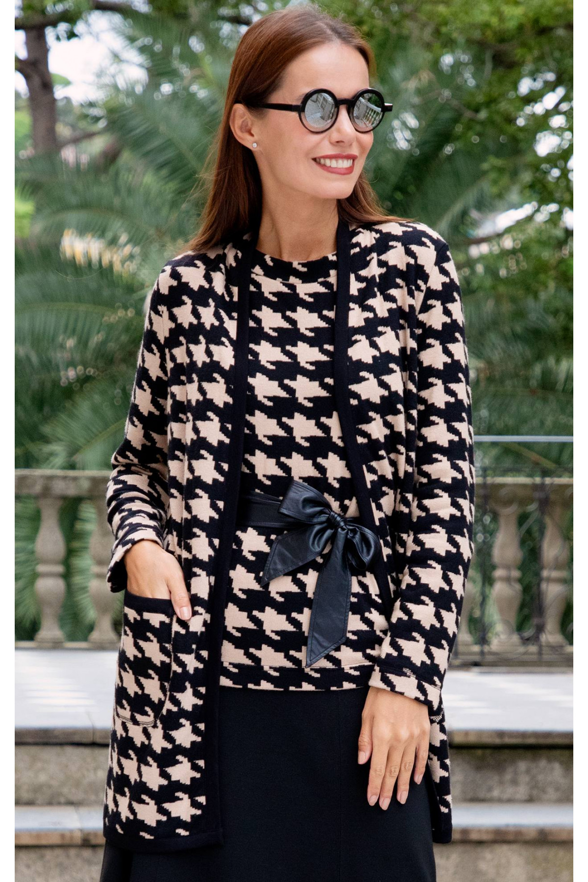 Cardigan cu mânecă lungă dintr-un material moale de colare bej pepit. Acesta este confecționat dintr-un material de tricot groasă și moale, care vă va oferi căldură și confort în zilele reci. Acest cardigan este o alegere perfectă pentru viața de zi cu zi, adăugând o notă finală și eleganță look-ului dvs. Asortați cu un pulover în același model sau cu o bluză uni cu guler rulant.