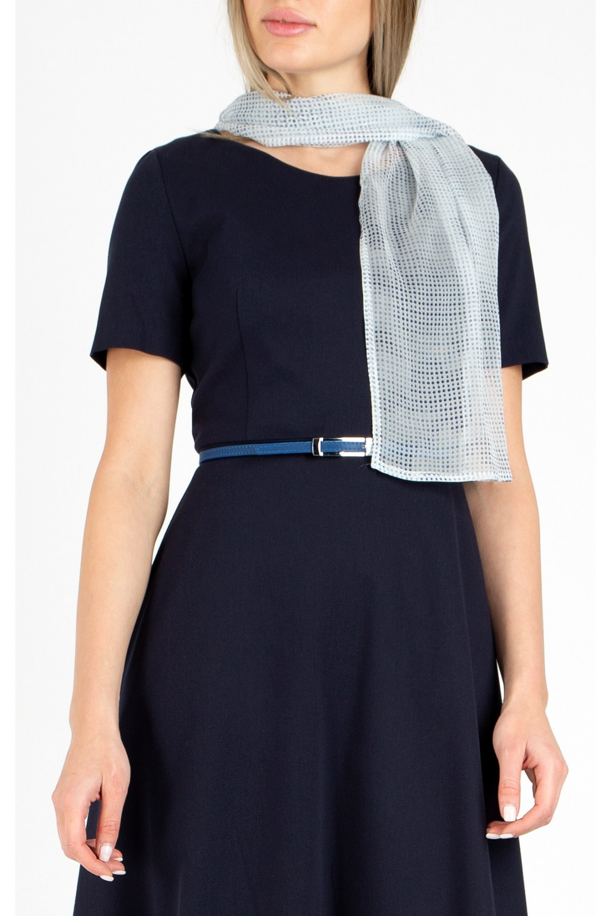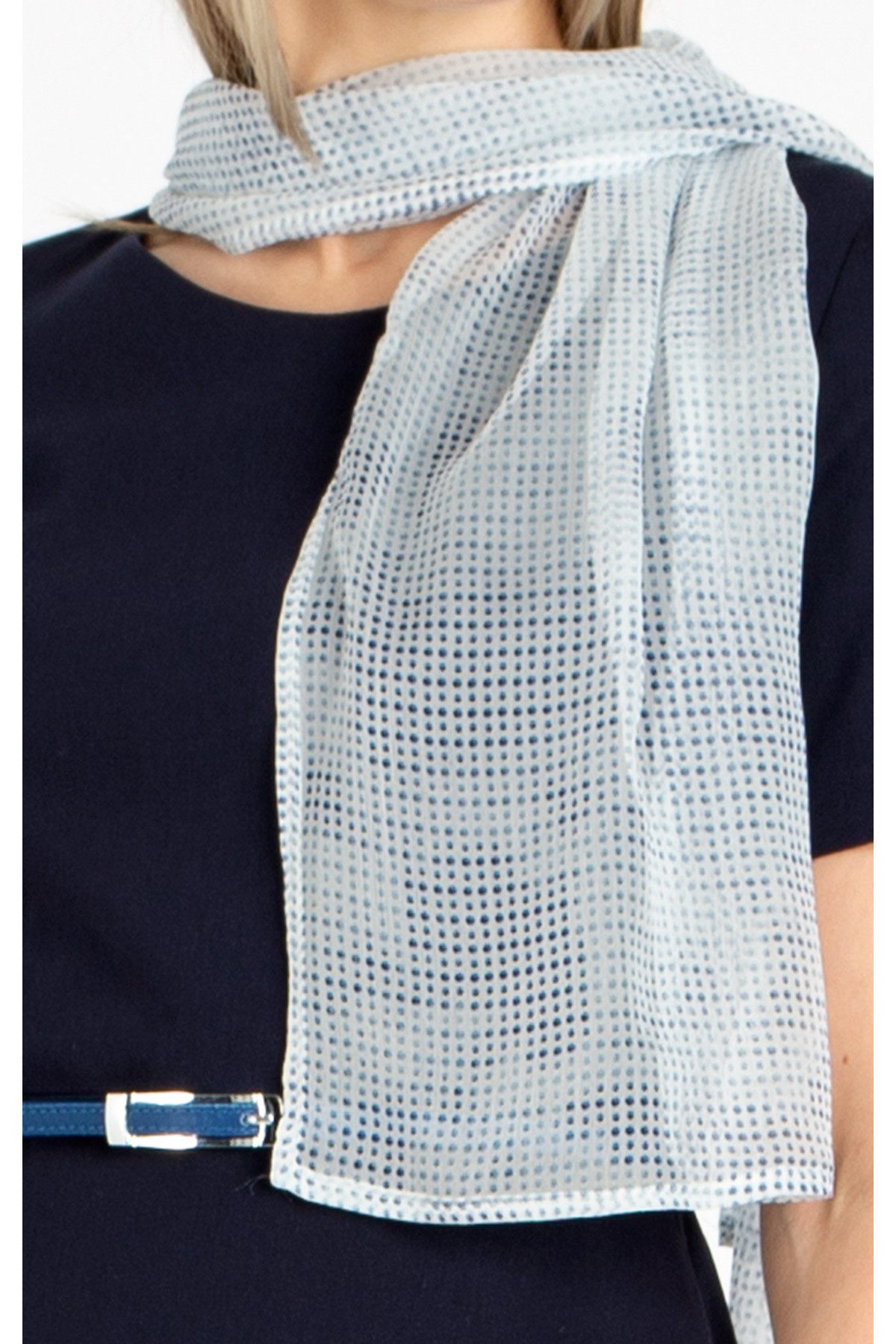 Eșarfă albă din mătase cu buline mici albastre. Aceasta este confecționată din mătase naturală cu imprimeu delicat care va completa aspectului dvs. Dimensiuni: 140/30cm.