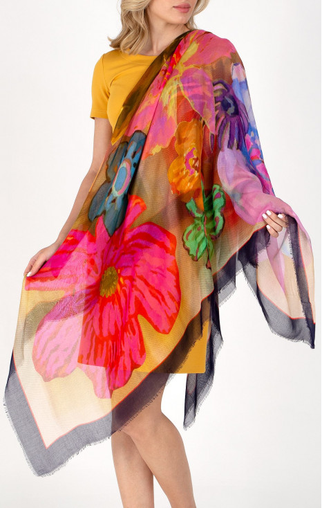 Eșarfă vaporoasă din mătase de culoare Hot Pink cu imprimeu floral stilizat