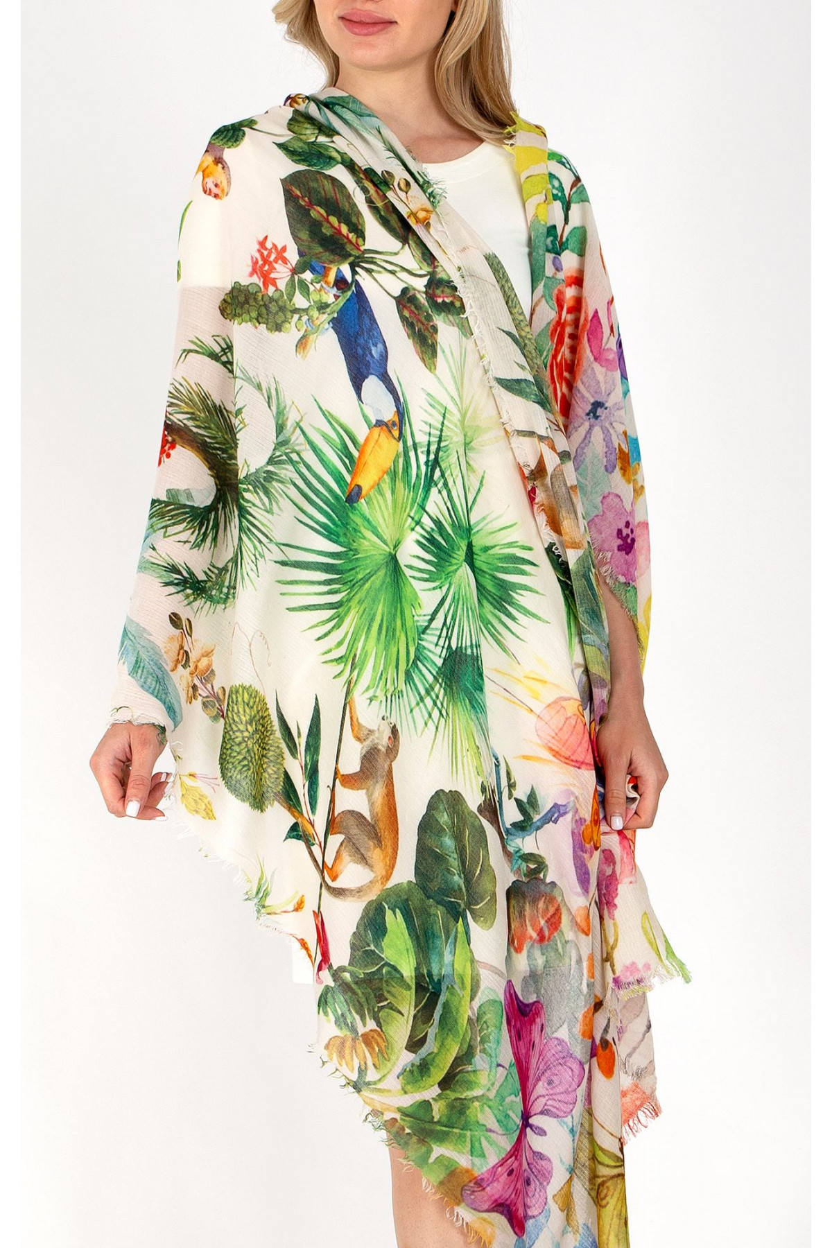 Eșarfă impresionantă care recreează o zână exotică de culori, transferată pe bumbac și modal, un accent deosebit care aduce multă dispoziție și grație.