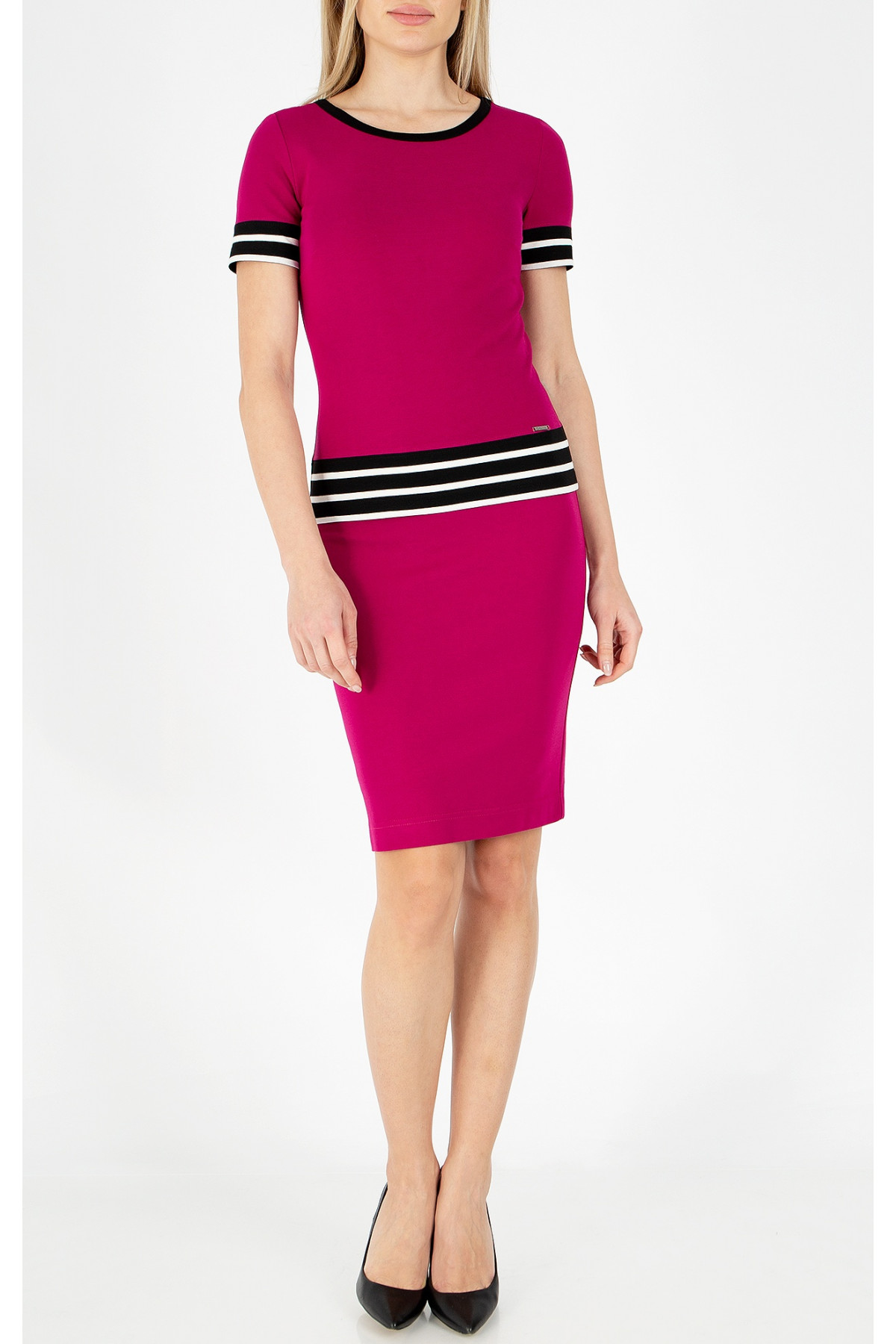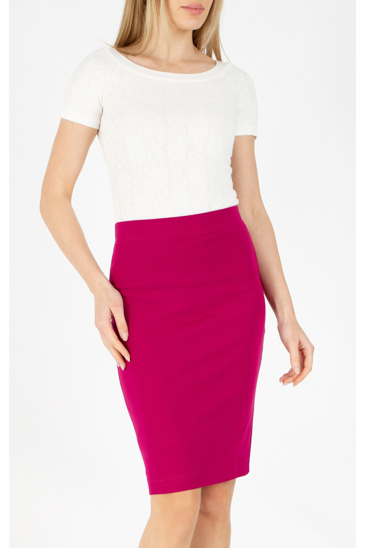 Fustă clasică tip creion de culoare Fuchsia Rose, confecționată dintr-un material de tricot de înaltă calitate. Fusta este potrivită pentru viața de zi cu zi și birou, puteți obține cu ușurință un aspect sportiv și elegant. Fusta are lungime clasică până la genunchi, cu siluetă mulată și talie elastică pentru un confort mai mare, cu o căptușeală. Puteți combina cu o mare varietate de bluze cu desen din colecția Daphne sau cu bluză din același desen. Această fustă este disponibilă în mărimile de la 36 până la 46.