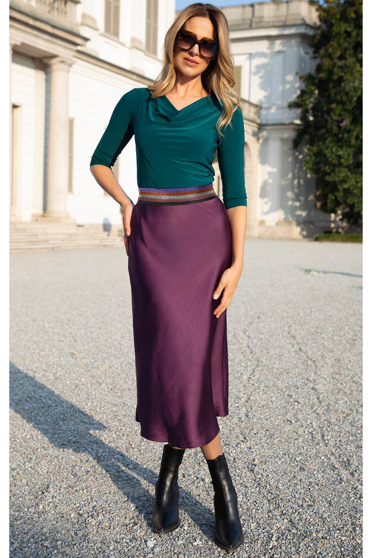 Fustă midi elegantă din satin, în culoarea Grape Wine. Fustă midi elegantă din satin, cu material neted și cu cădere grea, care oferă o senzație de lux, iar strălucirea delicată a satinului evidențiază frumusețea fiecărui gest. Talie decorativă multicoloră, cu fire metalice, reprezintă un accent stilat și luxos și asigură un plus de confort. Fusta este alegerea perfectă pentru ocazii speciale sau pentru eleganță în ținutele de zi cu zi.
