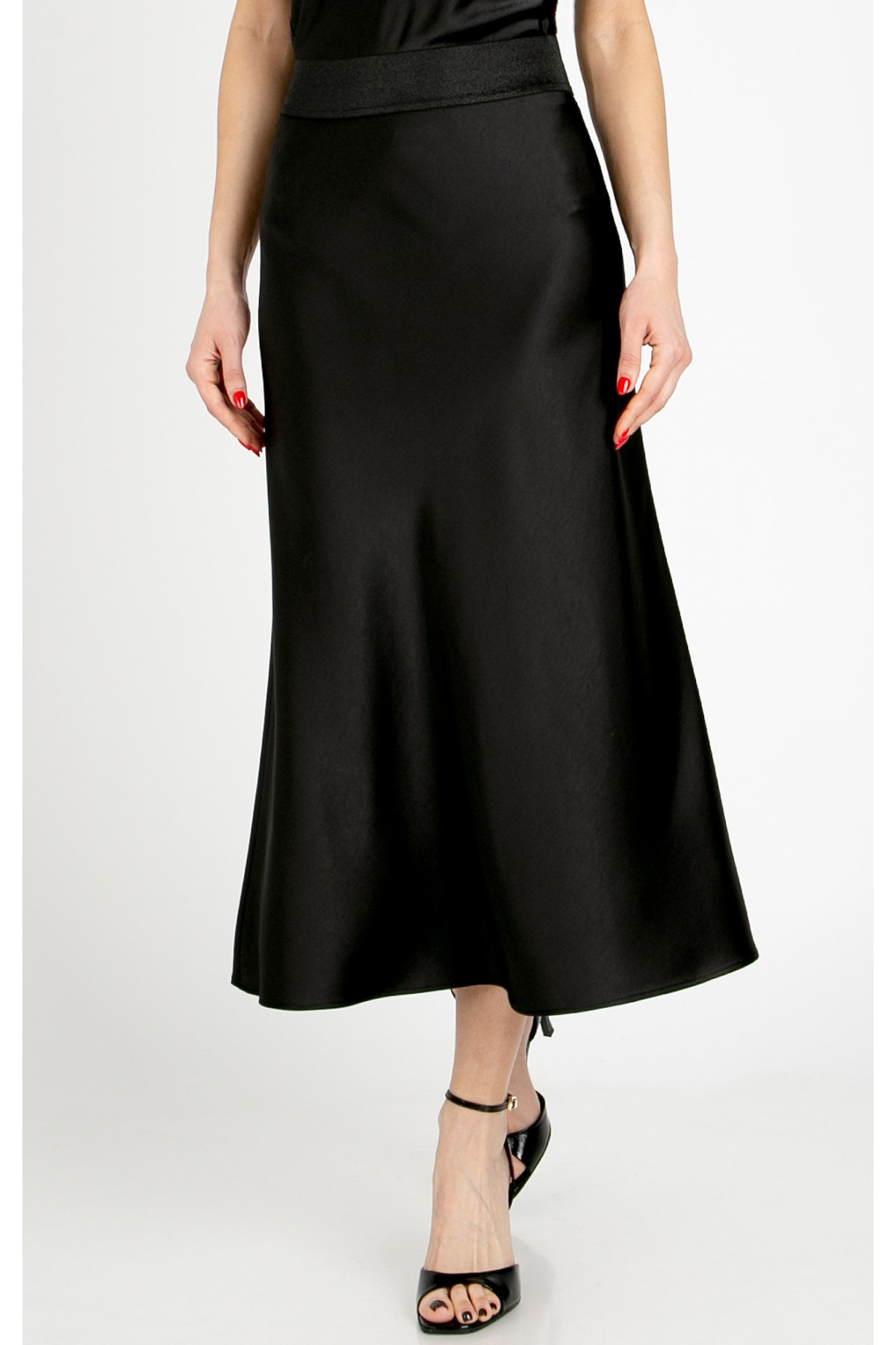 Fustă midi elegantă din satin dens, în culoarea neagră. Materialul neted, cu cădere grea, creează o senzație de lux, iar luciul delicat al satinului evidențiază frumusețea fiecărei mișcări. Elasticul decorativ cu fire metalice reprezintă un accent stilat și sofisticat, oferind totodată un plus de confort. Fusta este alegerea perfectă pentru ocazii speciale sau pentru a adăuga eleganță ținutelor de zi cu zi.