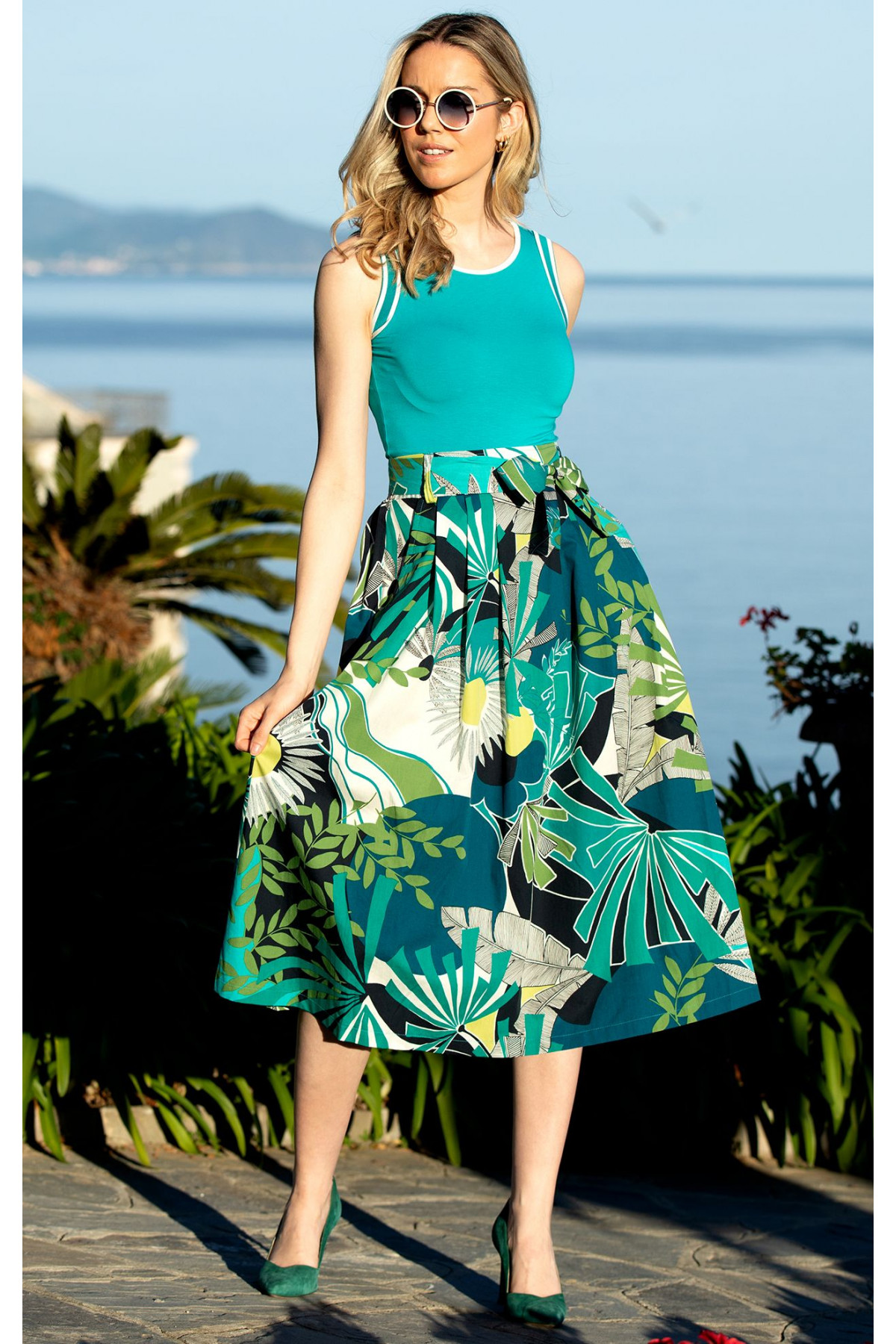 Fustă midi elegantă cu croială lejeră din bumbac în albastru-verde cu motive florale. Modelul are elastic în talie pentru un confort mai mare, buzunare laterale și curea lată în același model. Bazându-vă pe această fustă Daphne, care este potrivită pentru orice tip de siluetă corporală.