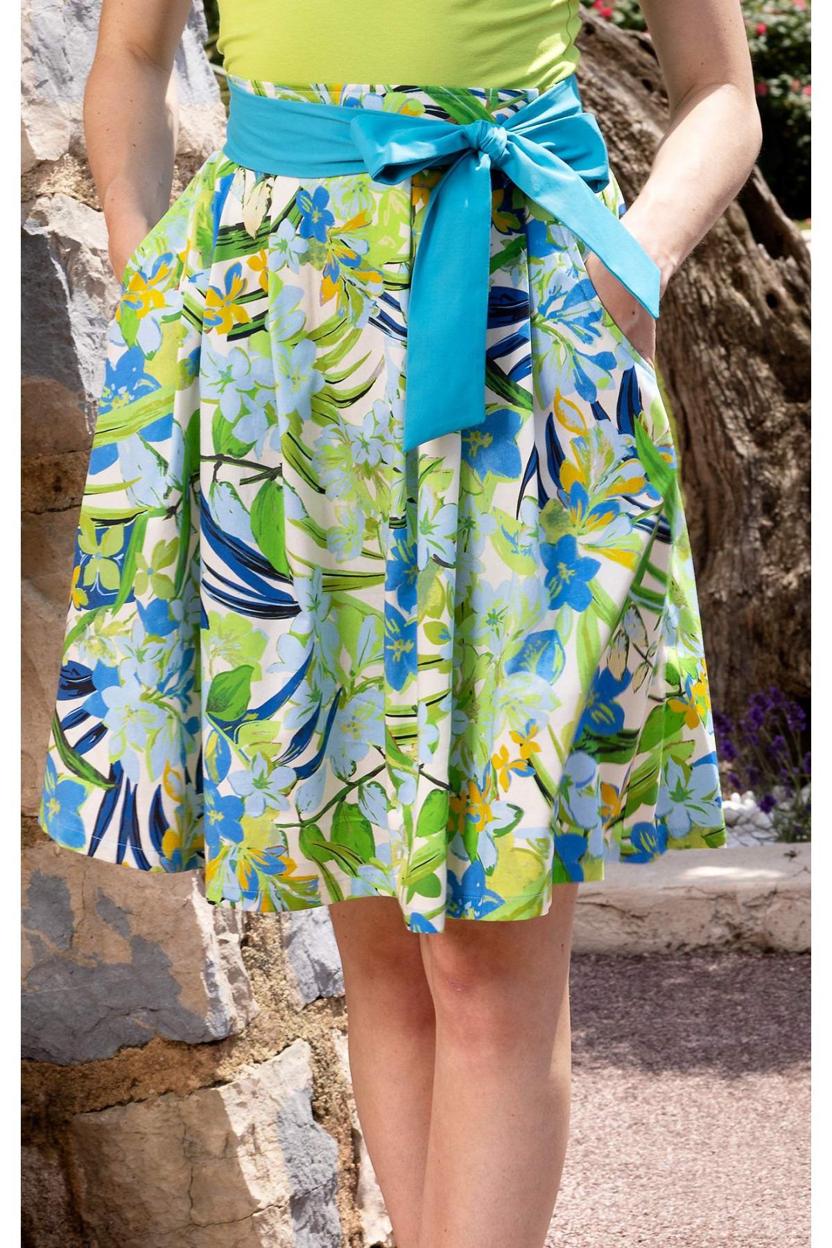 Fustă evazată din bumbac fin cu elastan cu desen floral într-o gamă delicată de albastru-verde