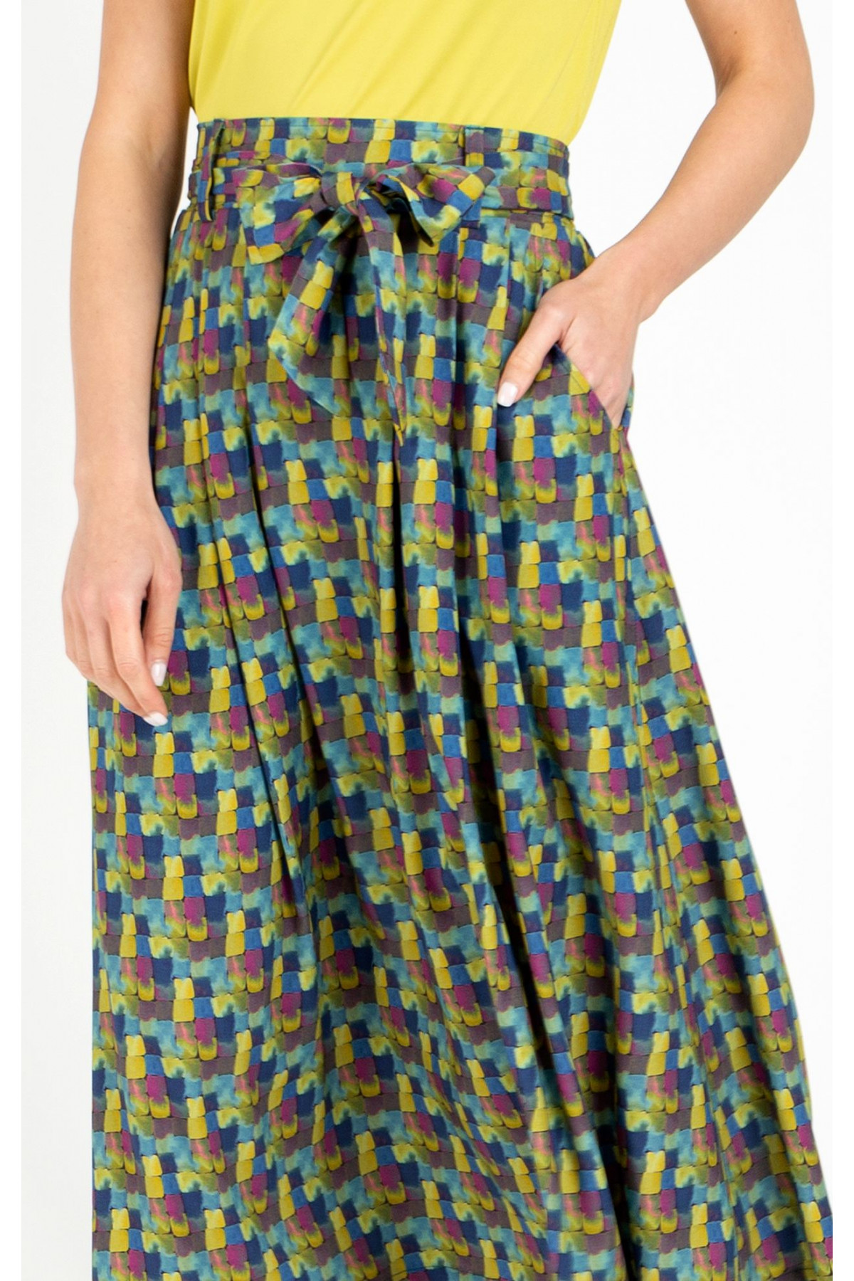 Fustă midi evazată cu imprimeu grafic în culori pastelate. Aceasta este confecționată dintr-un material de înaltă calitate de 100% viscoză, concepută într-un imprimeu grafic stilat. Modelul fustei are midi lungime cu o linie evazată, care oferă ușurință și grație la fiecare mișcare. Cureaua decorativă care subliniază frumos talia, adăugând o notă finală look-ului. Aceasta este potrivită pentru orice tip de siluetă și ocazie, conferind feminitate și confort în viața de zi cu zi.
