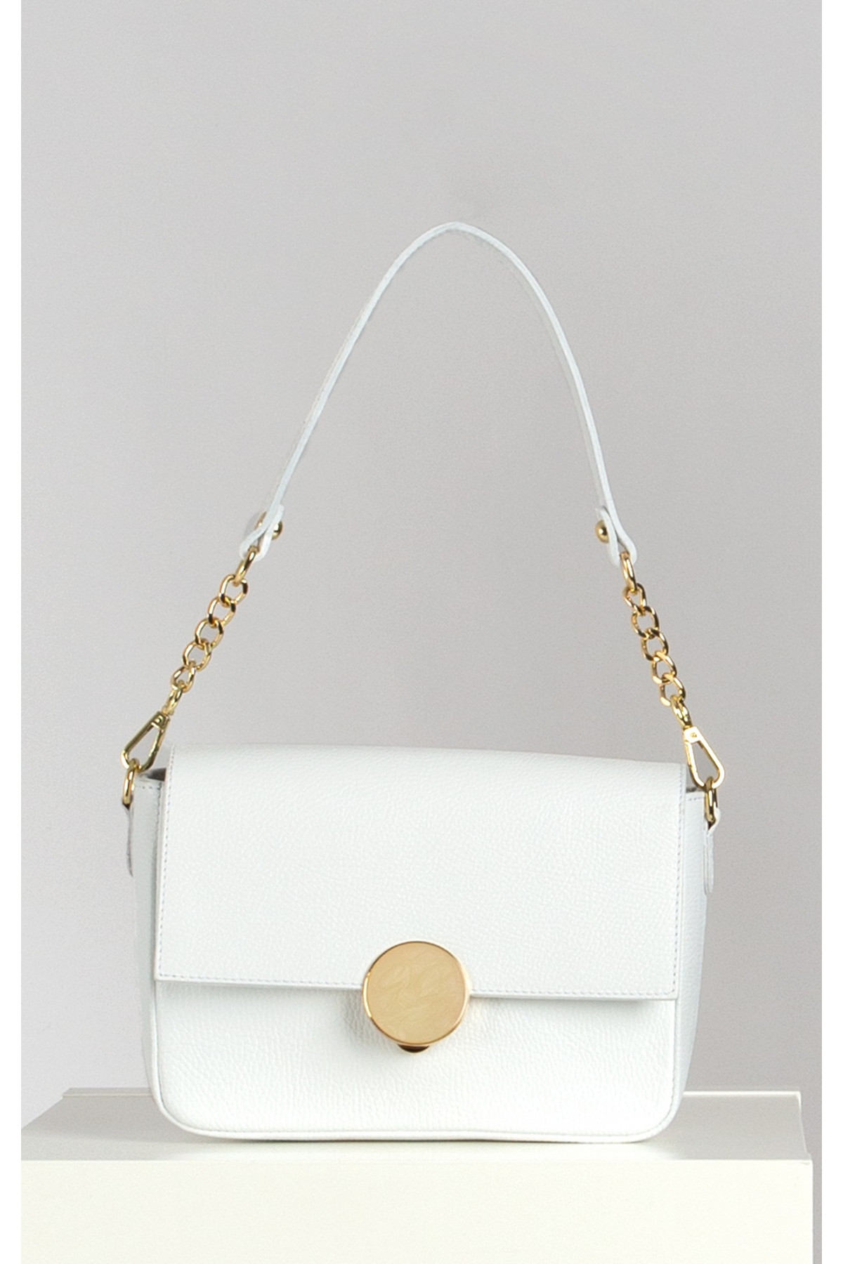 Geantă din piele naturală de culoare albă cu închidere cu fermoar. Cu un compartiment comun cu un mic buzunar cu fermoar. Geantă dispune de măner mai- scurt cu ornamente metalice aurii și are posibilitatea să fie purtata si cu curea lungă reglabilă. Fabricată în Italia la comanda Daphne. Dimensiuni: lungime:28cm înălțime:18 cm