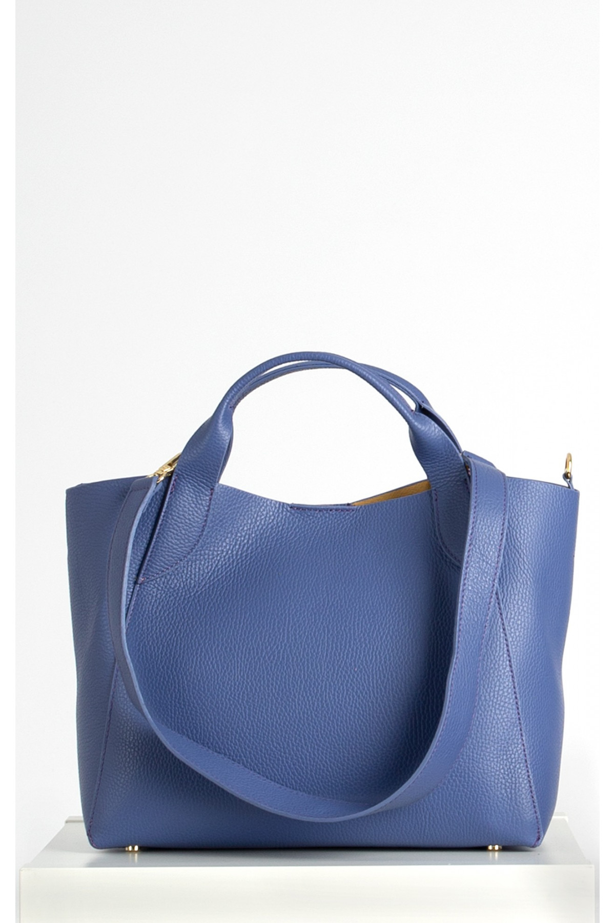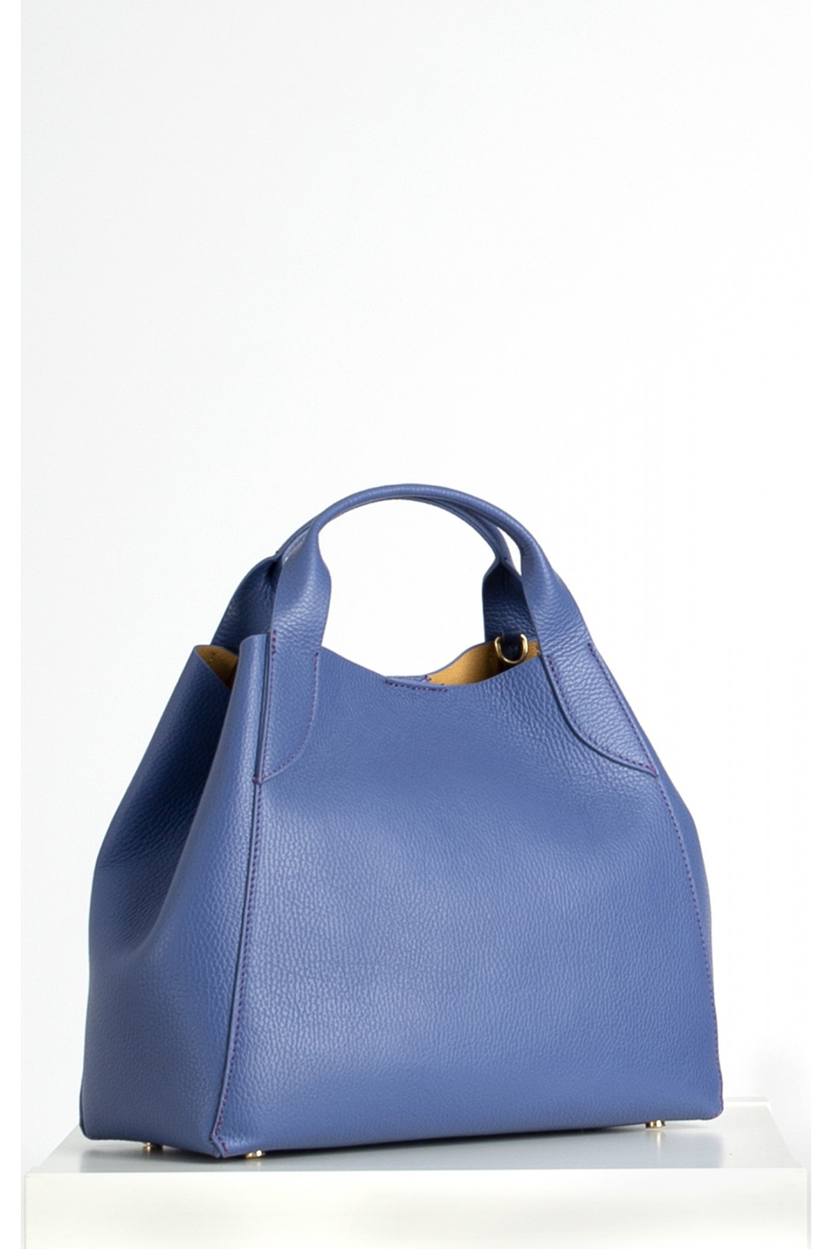 Geantă din piele naturală de culoare - Blue Ice.Fără fermoar, cu închidere cu nasture cu magnet.Modelul genții este cu un compartiment în care are o trusă din poliester, cu fermoar și logo.O posibilitate superbă de a organiza și a muta bagajul într-o altă geantă.Geantă are două mănere standarte, dar și are posibilitatea de a fi purtata cu curea lungă.  Fabricată în Italia la comanda Daphne. Dimensiuni: lungime:37cm, înălțime:26cm,adâncime:13cm
