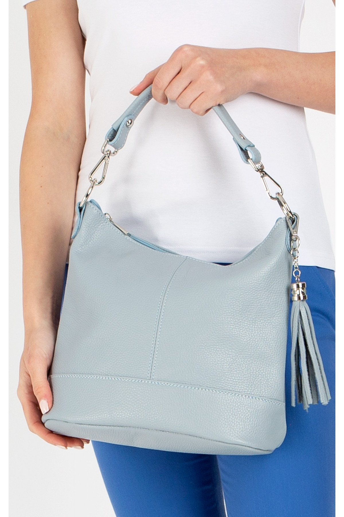 Geantă din piele naturală cu închidere cu fermoar. Cu un compartiment în care are două mici buzunare laterale-unul cu fermoar cu un mic buzunar iar al doilea pentru depozitare telefon mobil. Geantă are și un buzunar exterior care se închide cu fermoar. Fabricată în Italia la comanda Daphne. Dimensiuni: 28/26/13